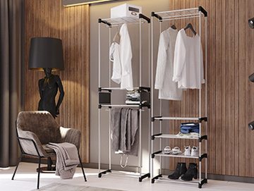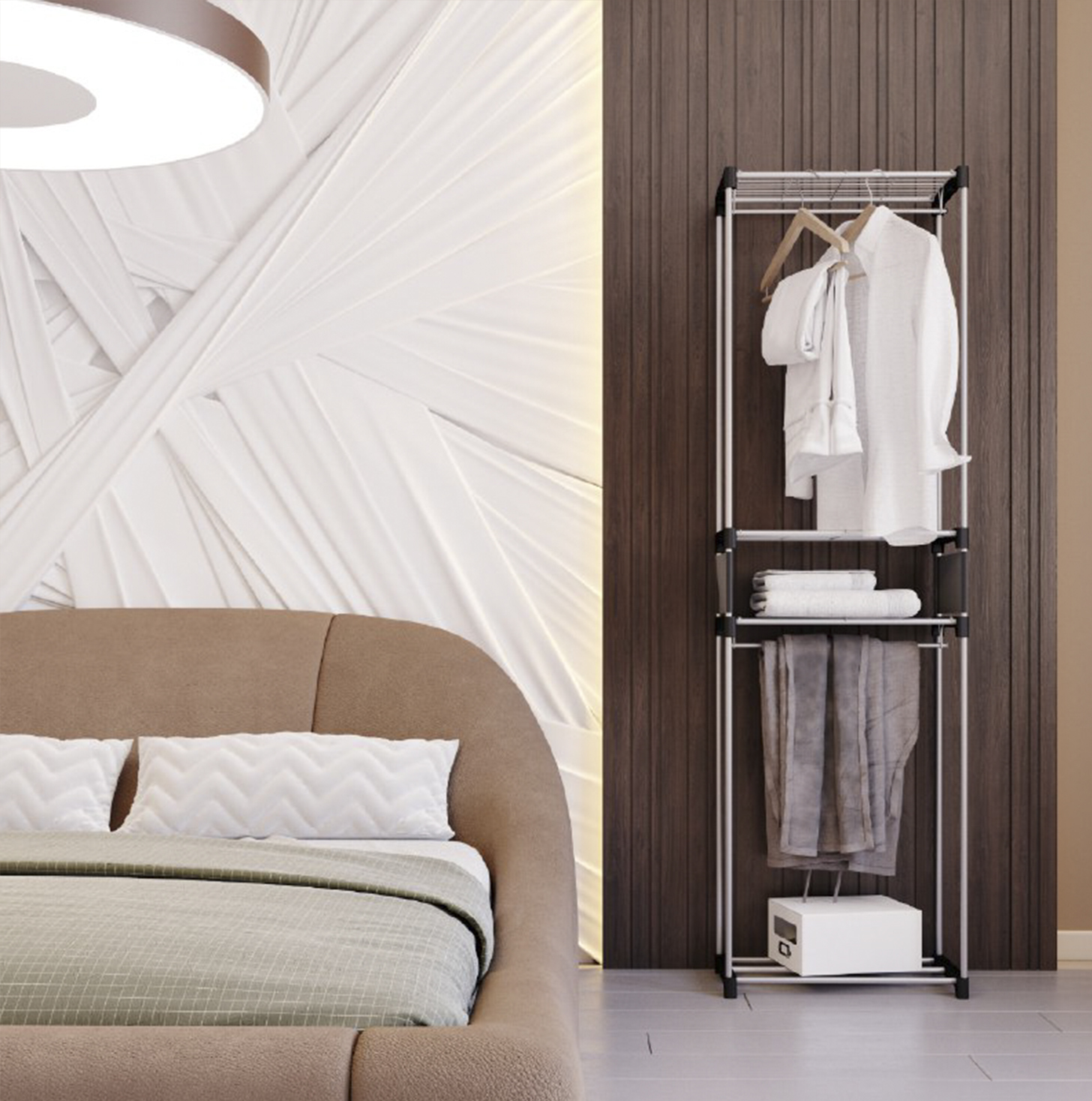 Объем вещей, который обычно занимает массивный стеллаж, легко помещается на одну компактную напольную вешалку. Вы освобождаете место для жизни, а не для хранения.