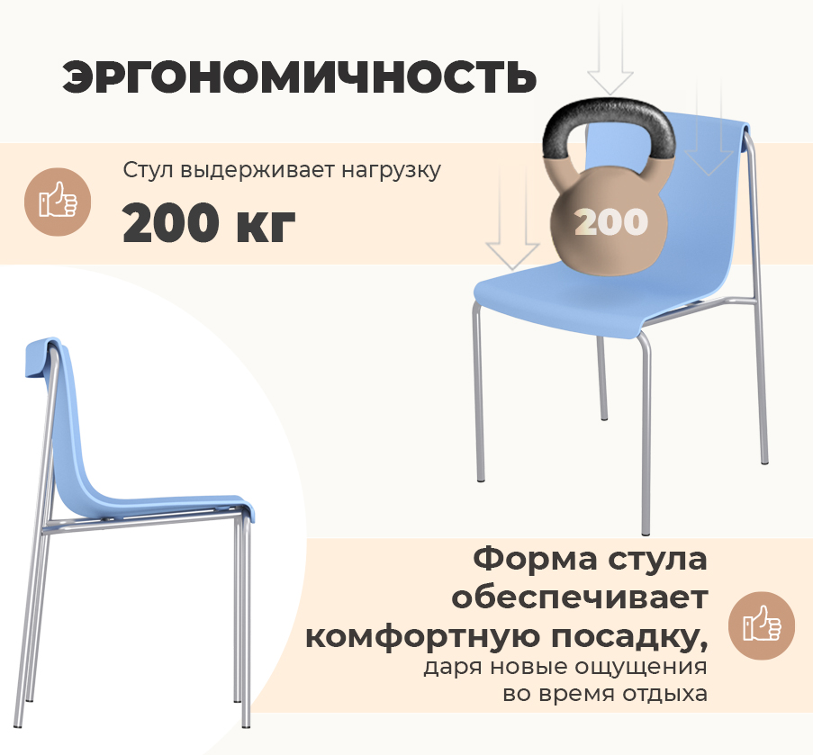 Сиденье изготовлено из полипропилена с армирующими добавками. Каркас стула выполнен из металла с порошковым покрытием. Все это обеспечивает высокую жесткость и надежность конструкции. Стул устойчив к ударам, воздействиям окружающей среды и появлению царапин.