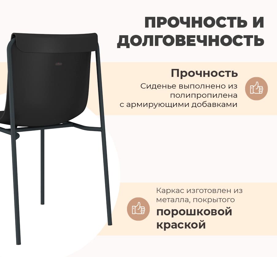 Сидение изготовлено из полипропилена с армирующими добавками, каркас выполнен из металла с порошковым покрытием. Все это обеспечивает высокую жесткость и надежность конструкции. Стул устойчив к ударам, воздействиям окружающей среды и появлению царапин.