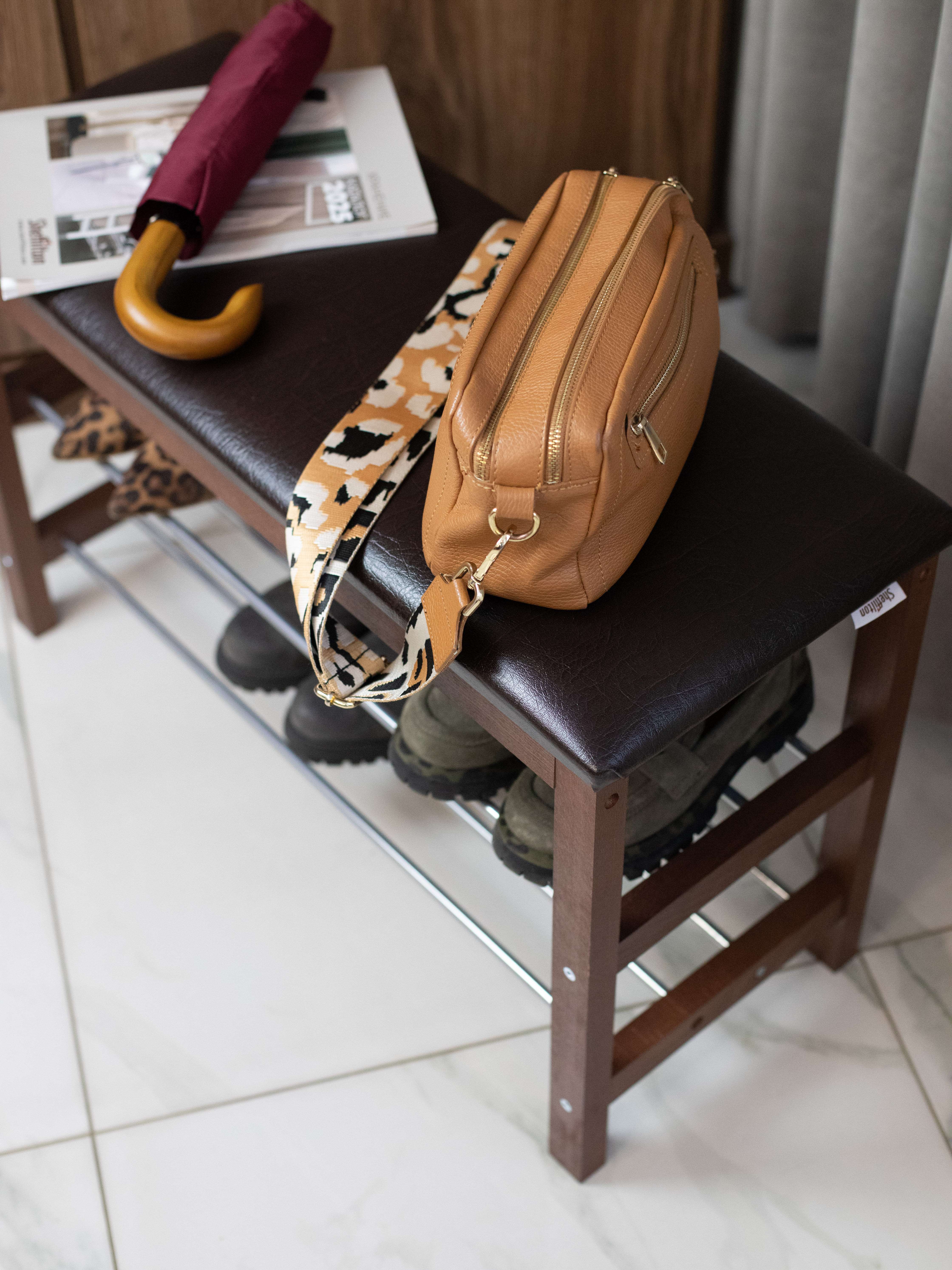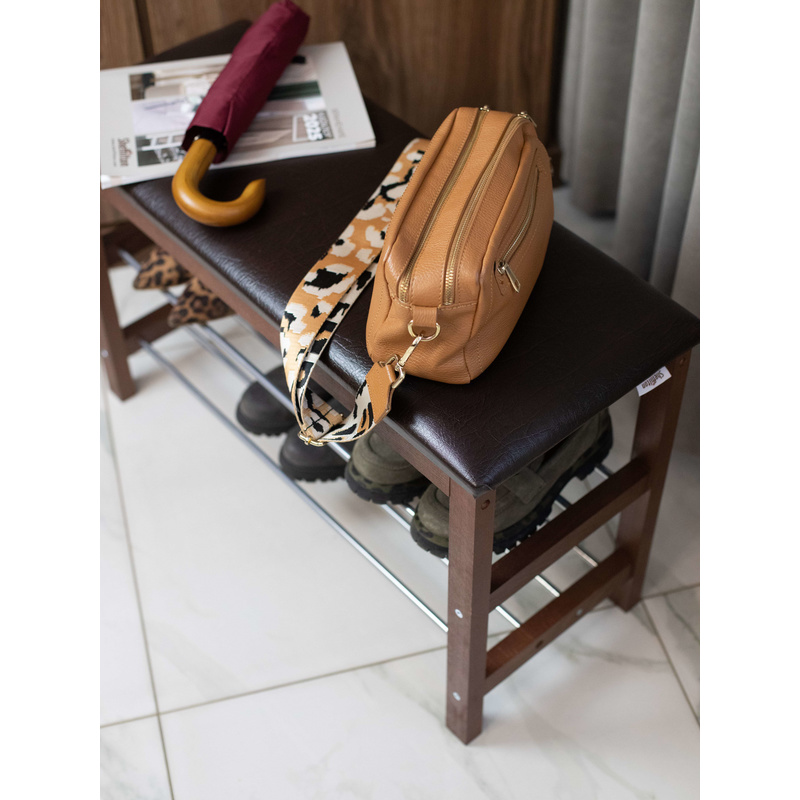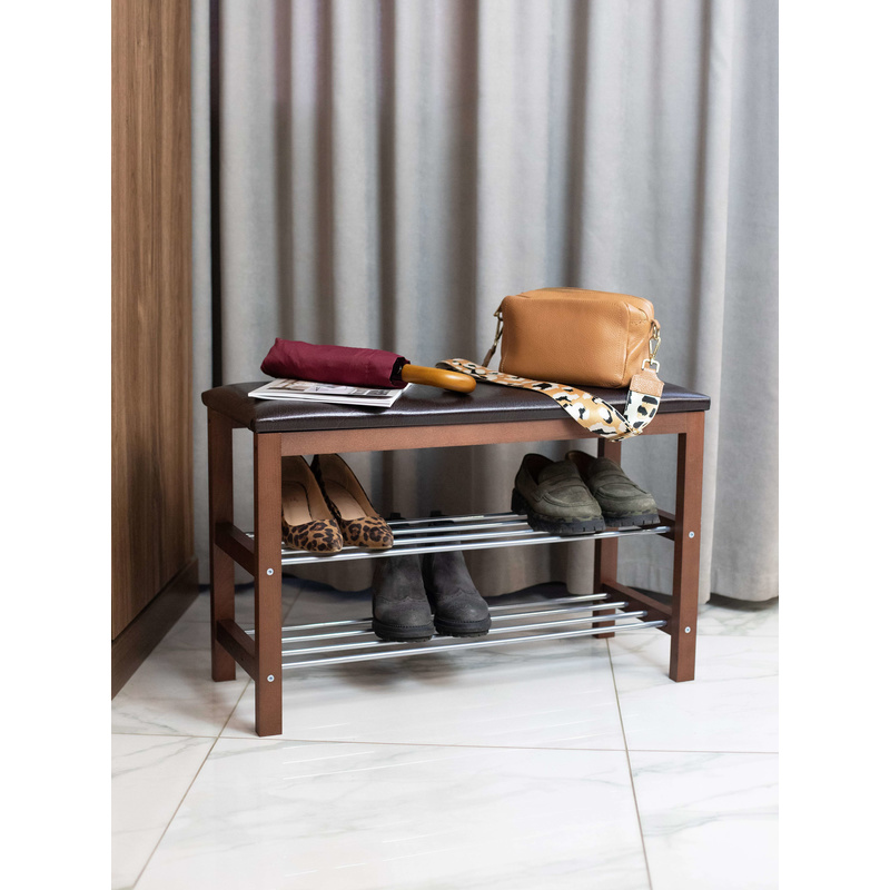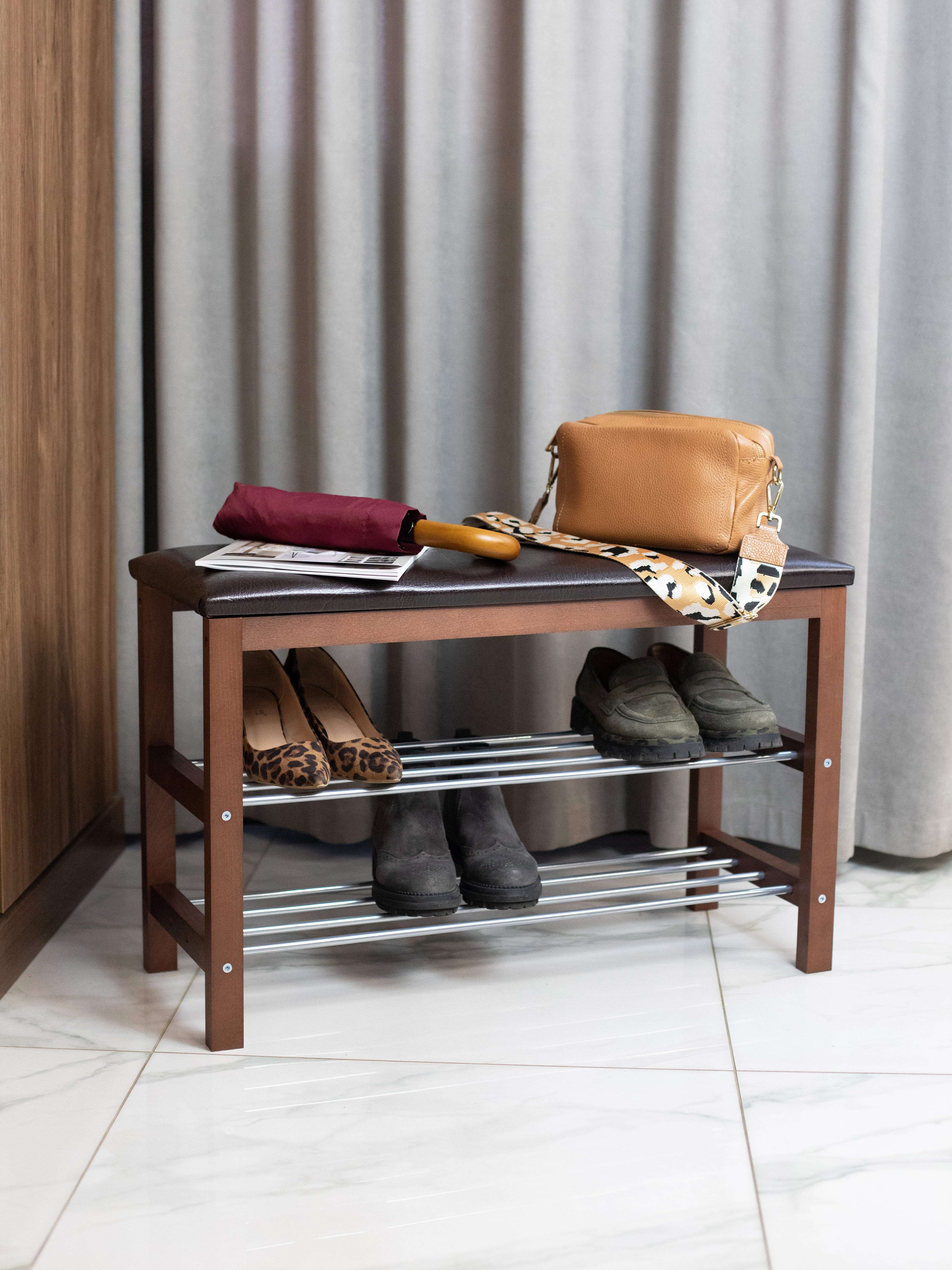 Уютная банкетка с мягким сидением и полками для размещения обуви и тапочек.
