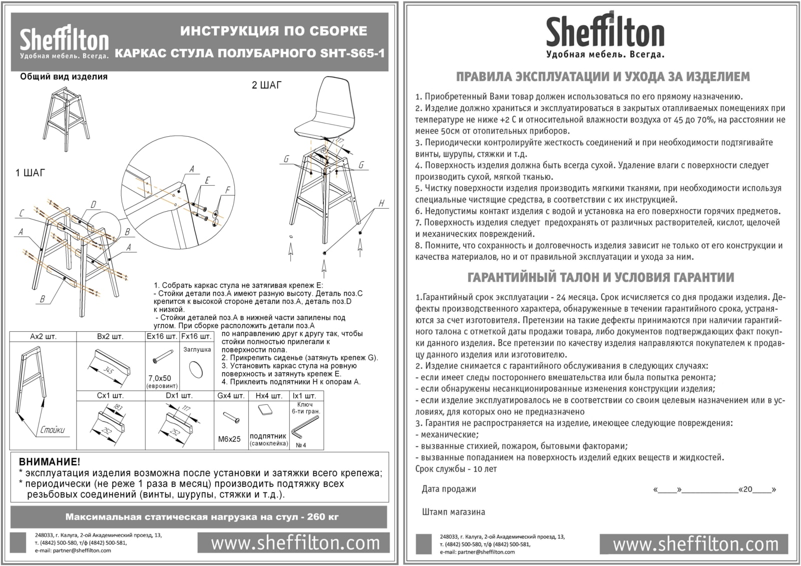 Каркас выполнен из массива древисины твердых пород с последующим тонированием и покрытием лаком. Специальные подпятники каркаса обеспечивают защиту покрытия от царапин и повышают устойчивость стула. К каркасу приложен комплект крепежа и схема сборки.Максимальная статическая нагрузка - 260 кг.
