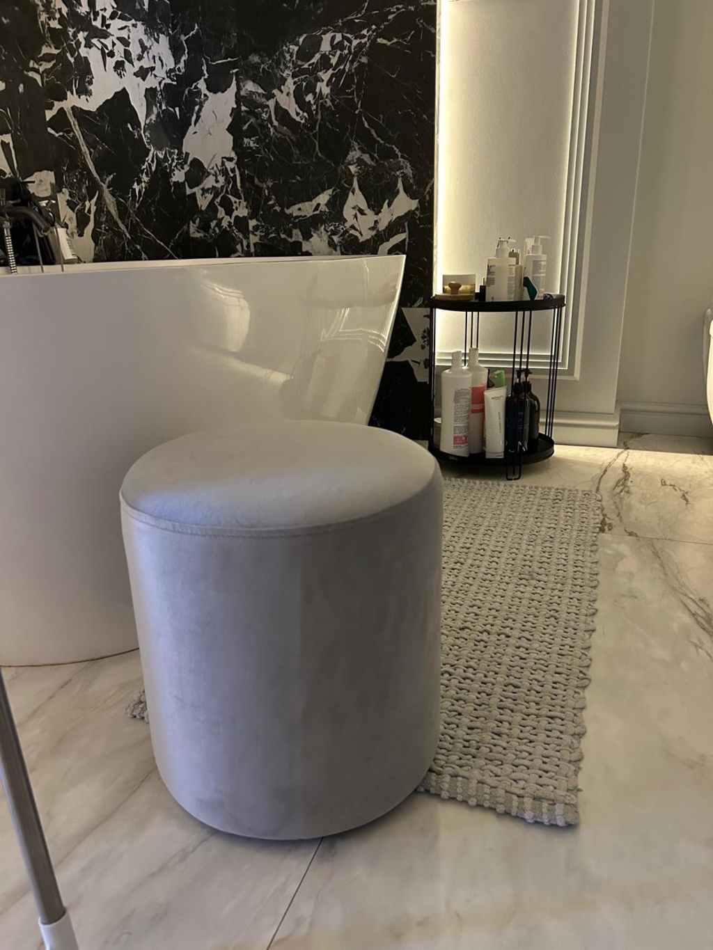 Ножки выполнены из прочного пластика. Сидение выполнено из микровелюра с мягким наполнителем. Высота пуфа 380 мм.