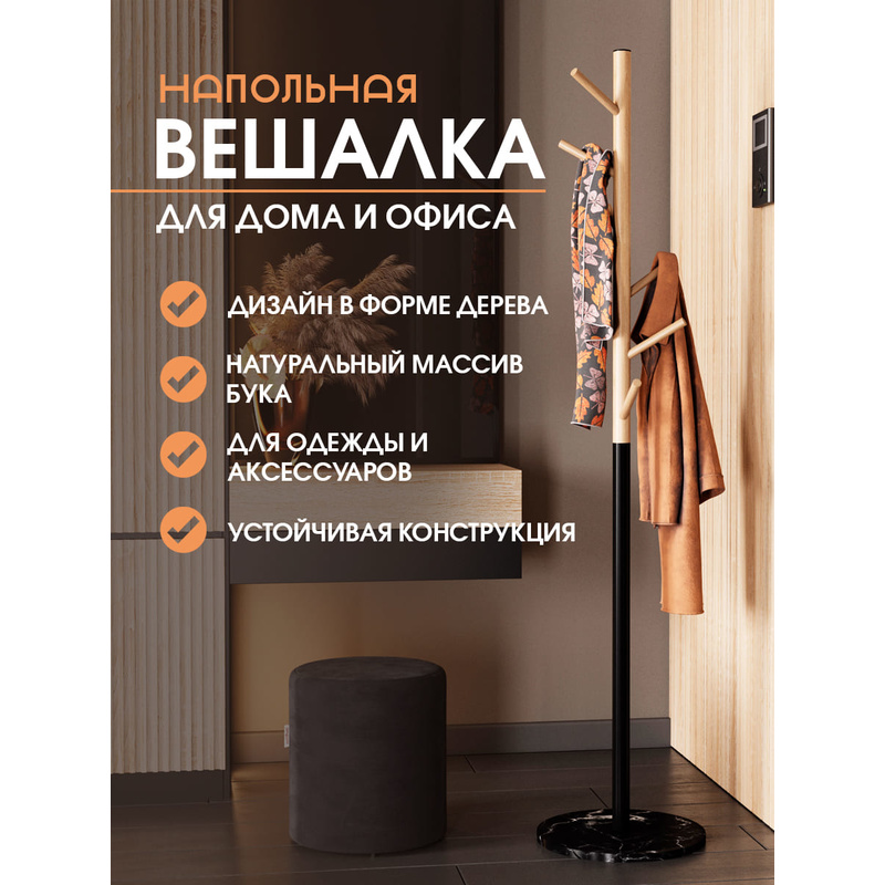 Сочетание натурального бука, мрамора и металла подойдет для дома, офиса и других общественных учреждений. Верхняя часть вешалки-стойки выполнена из натурального бука, 6 крючков расположены "по спирали", что позволяет компактно разместить верхнюю одежду.