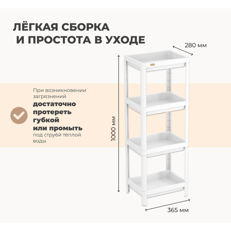 Стеллаж удобен в использовании за счёт своей компактности и вместительности. В детской комнате он идеально подойдёт для хранения любимых игрушек вашего ребёнка. На даче или балконе вы сможете разместить цветы и рассаду или использовать его для хранения мелочей. На кухне он станет дополнительным местом для хранения круп, специй и посуды. А в ванной комнате стеллаж с лёгкостью вместит ваши любимые средства по уходу и принадлежности для стирки и уборки.