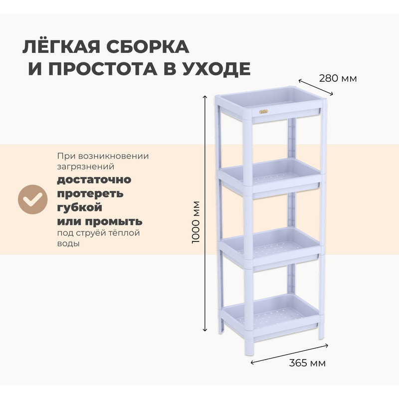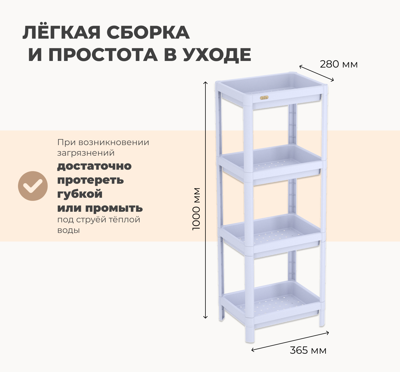 Стеллаж удобен в использовании за счёт своей компактности и вместительности. В детской комнате он идеально подойдёт для хранения любимых игрушек вашего ребёнка. На даче или балконе вы сможете разместить цветы и рассаду или использовать его для хранения мелочей. На кухне он станет дополнительным местом для хранения круп, специй и посуды. А в ванной комнате стеллаж с лёгкостью вместит ваши любимые средства по уходу и принадлежности для стирки и уборки.