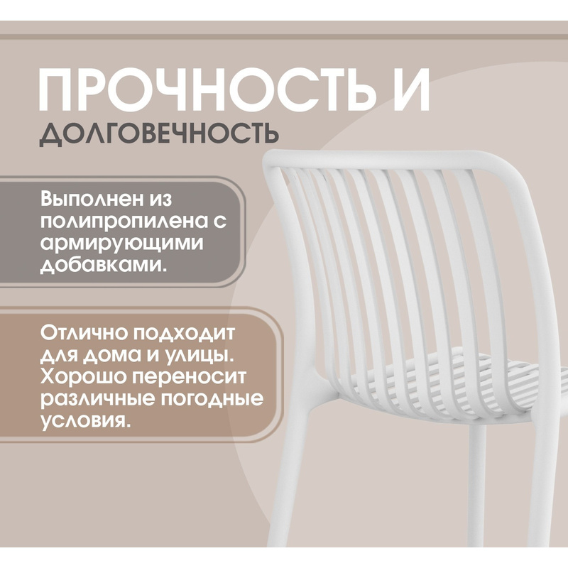 Благодаря повышенным АТМОСФЕРОСТОЙКИМ СВОЙСТВАМ, стул хорошо переносит воздействие различных погодных условий. Не деформируется и имеет более устойчивое сопротивление к изменению цвета и прочностных характеристик на открытом воздухе при температуре от -15 С до +40 С. При этом, важно отметить, что насыщенность цвета во многом будет определяться интенсивностью солнечного света и продолжительностью нахождения под ним.