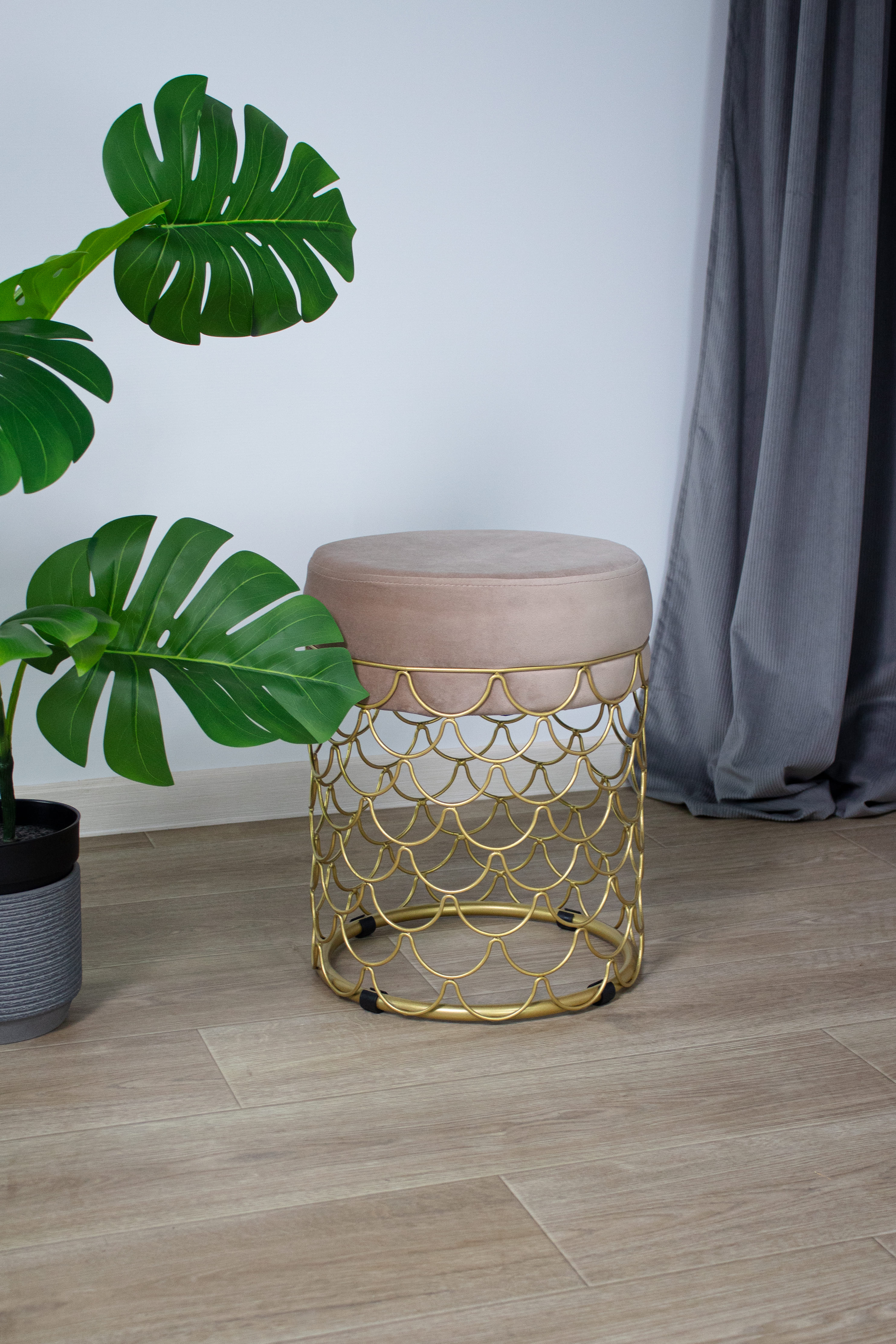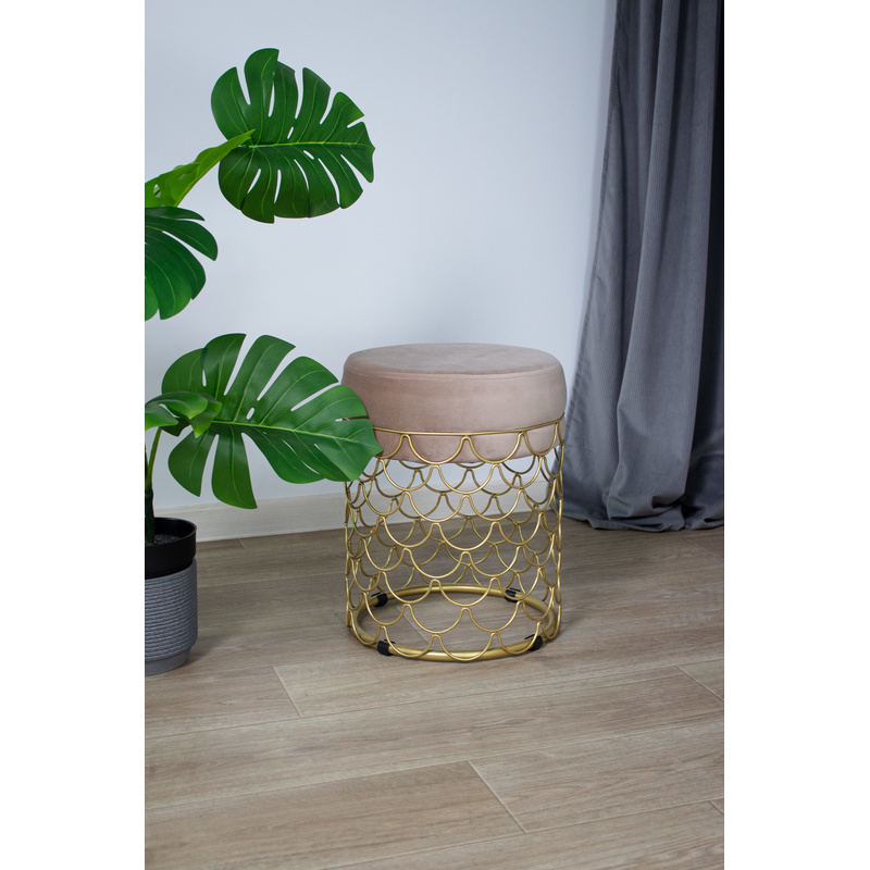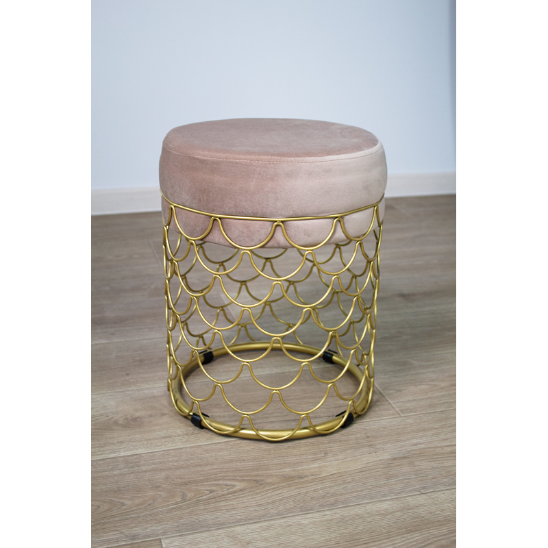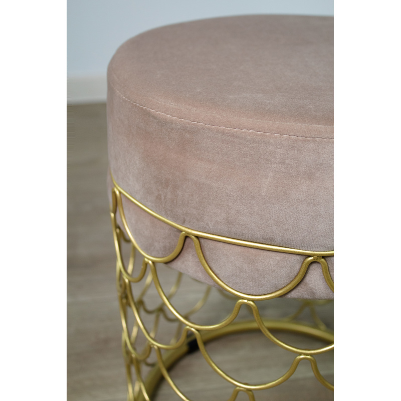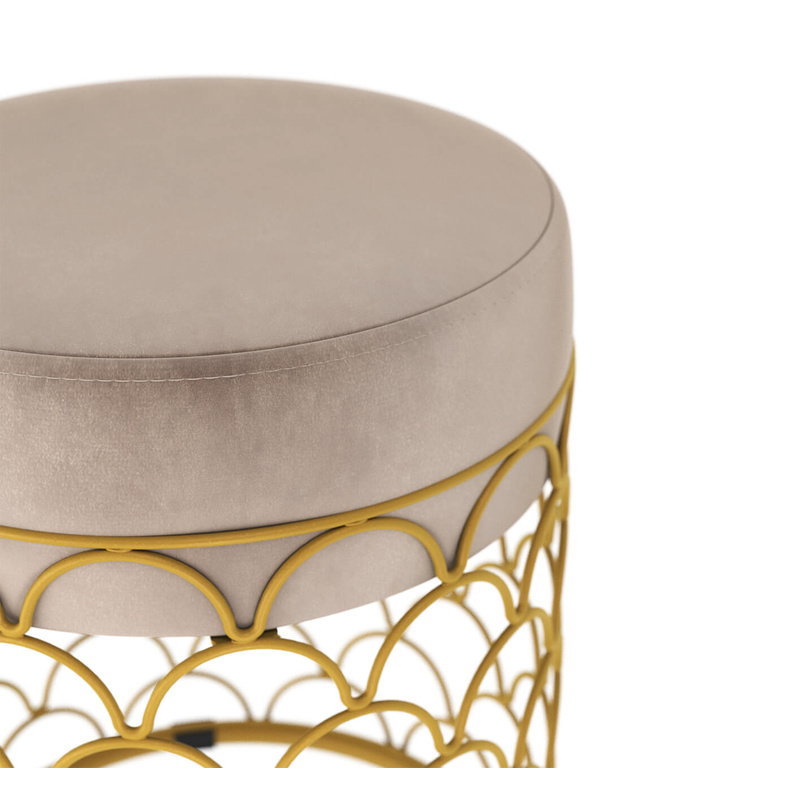 Пуф добавит уюта и разбавит Ваш интерьер. Главное украшение золотое металлическое основание с тонкими элементами из прутка. Надежность металла и мягкость ткани прекрасно сочетаются в готовом исполнении пуфа.