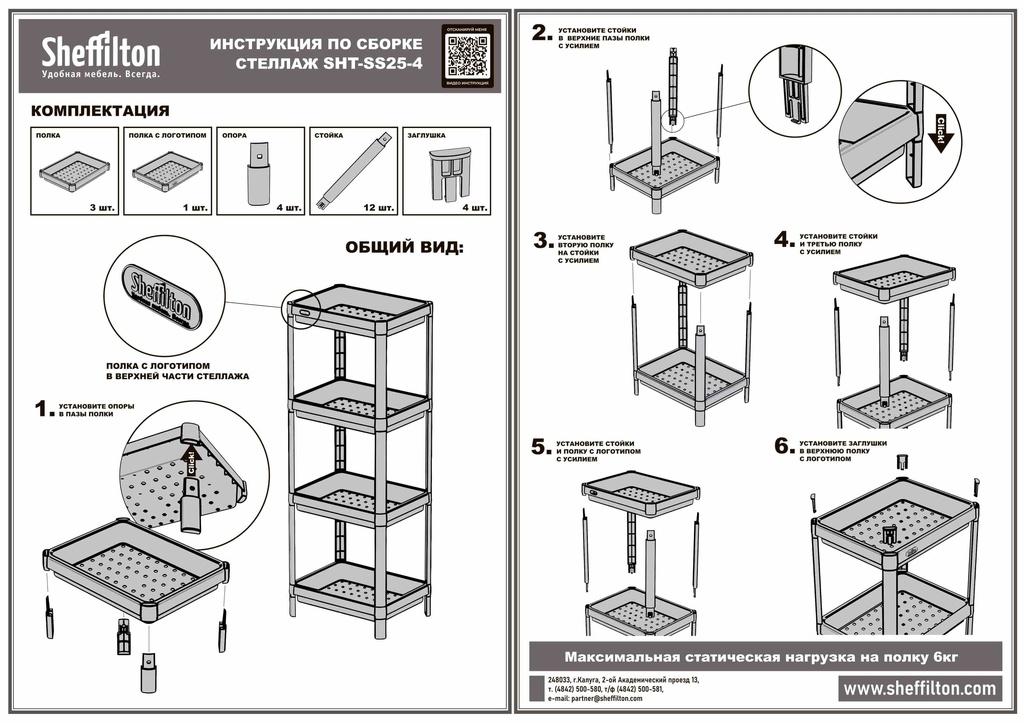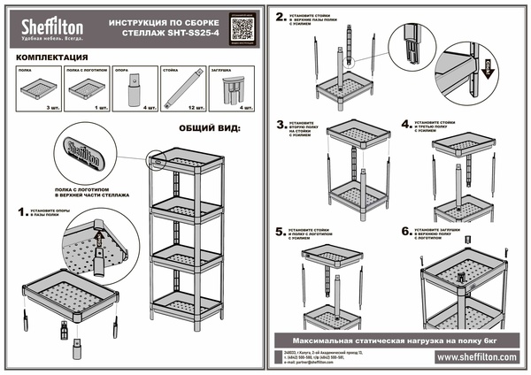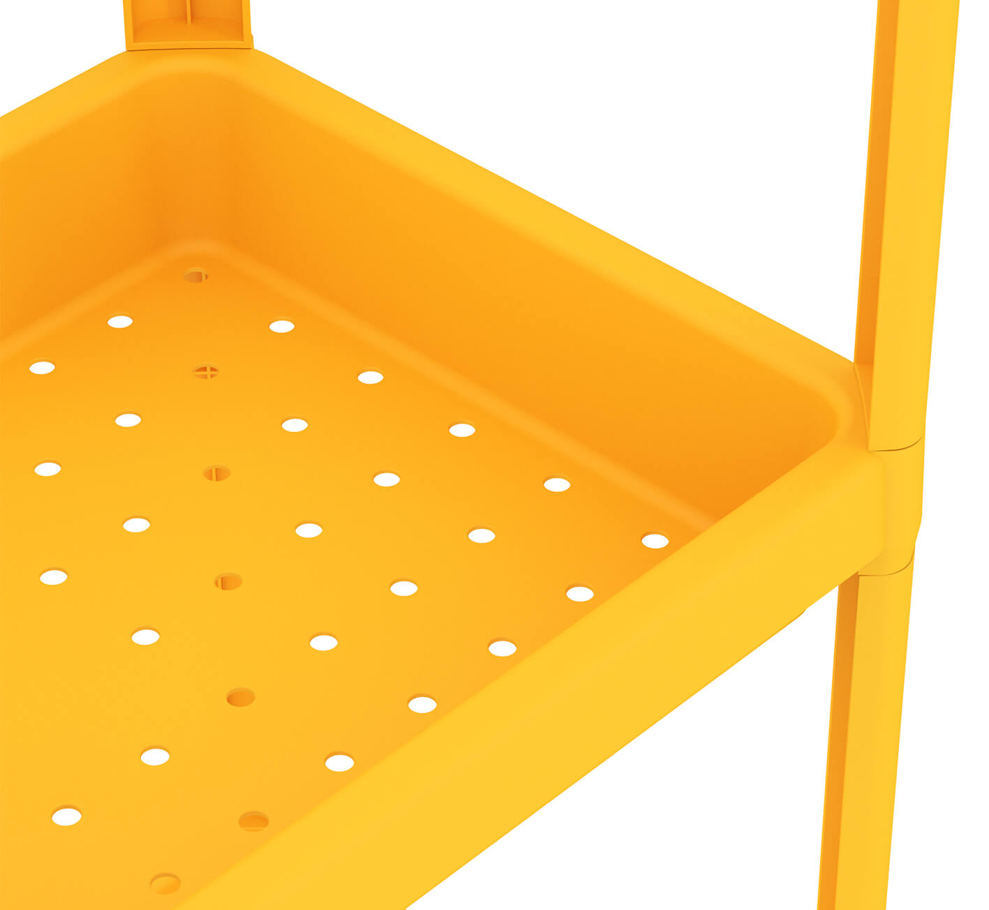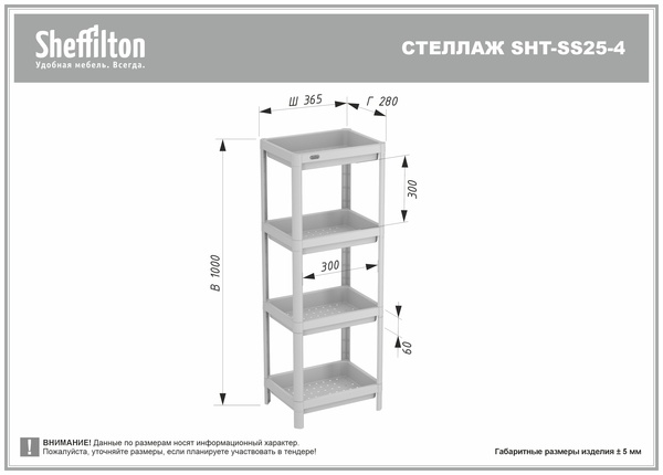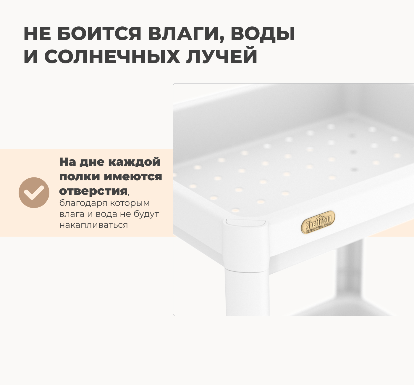 Этот стеллаж оснащён четырьмя полками с бортиками высотой 6 см , которые надежно защищают ваши вещи от падения. На дне каждой полки имеются отверстия, благодаря которым влага и вода не будут накапливаться.