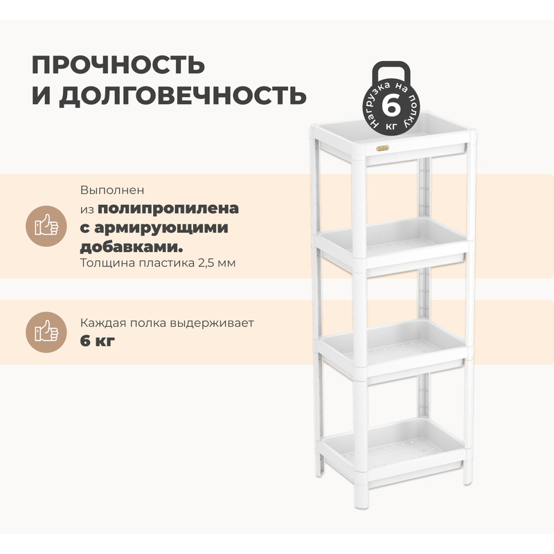 Стеллаж выполнен из полипропилена с армирующими добавками толщина пластика составляет 2,5 мм, что обеспечивает высокую жесткость и надежность конструкции. Благодаря этому, каждая полка выдерживает 6 кг. Изделие устойчиво к ударам, воздействиям окружающей среды, не боится воды, влаги и солнечных лучей, поэтому этажерку можно использовать в любых условиях.