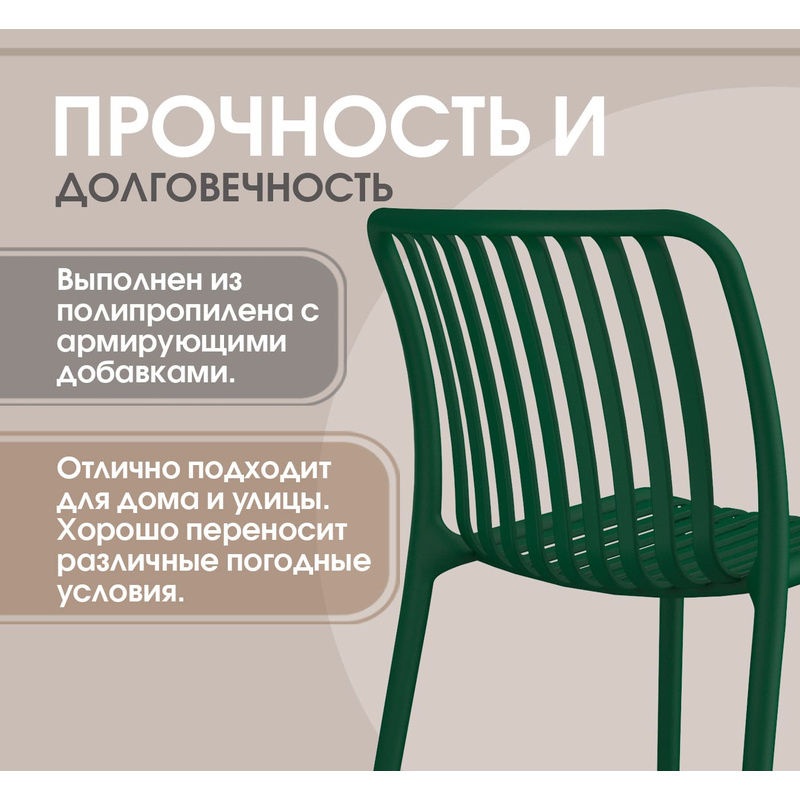 Обеденная группа выполнена из полипропилена с армирующими добавками, благодаря которым повышается жесткость и надежность. Изделие устойчиво к ударным воздействиям, негативным воздействиям окружающей среды и появлению царапин.