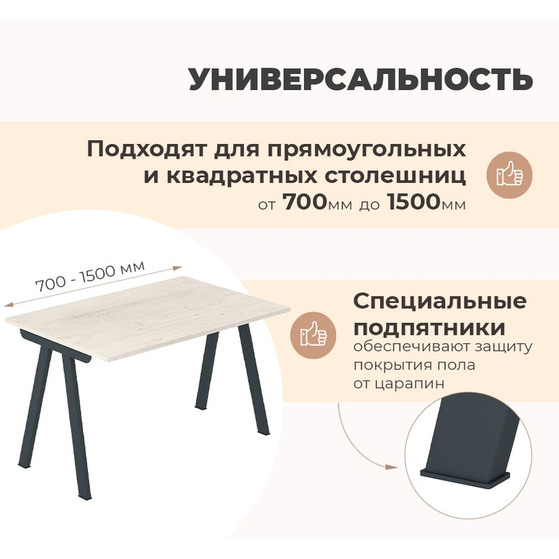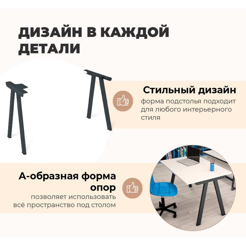 Продуманная форма опор позволяет использовать все пространство под столом как вам удобно. Опоры подходят для прямоугольных и квадратных столешниц от 700 до 1500 мм.