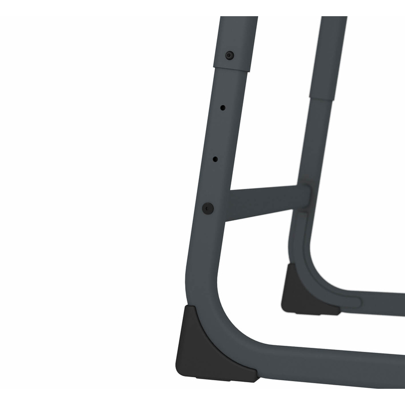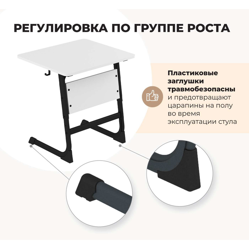 Столешница не имеет острых углов — все углы аккуратно закруглены, что делает ее травмобезопасной. Специальные заглушки каркаса предотвращают царапины на полу во время эксплуатации стула и травмобезопасны.