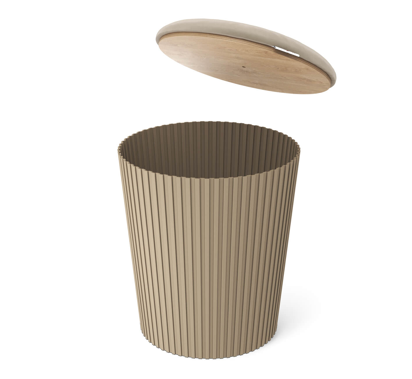 Верхняя часть пуфика открывается, образуя удобное внутреннее пространство для хранения. Внутрь можно убрать пледы, журналы, аксессуары или другие мелочи, поддерживая порядок и визуальную чистоту интерьера. Такое решение делает пуфик не только декоративным элементом, но и практичным помощником в повседневной жизни.