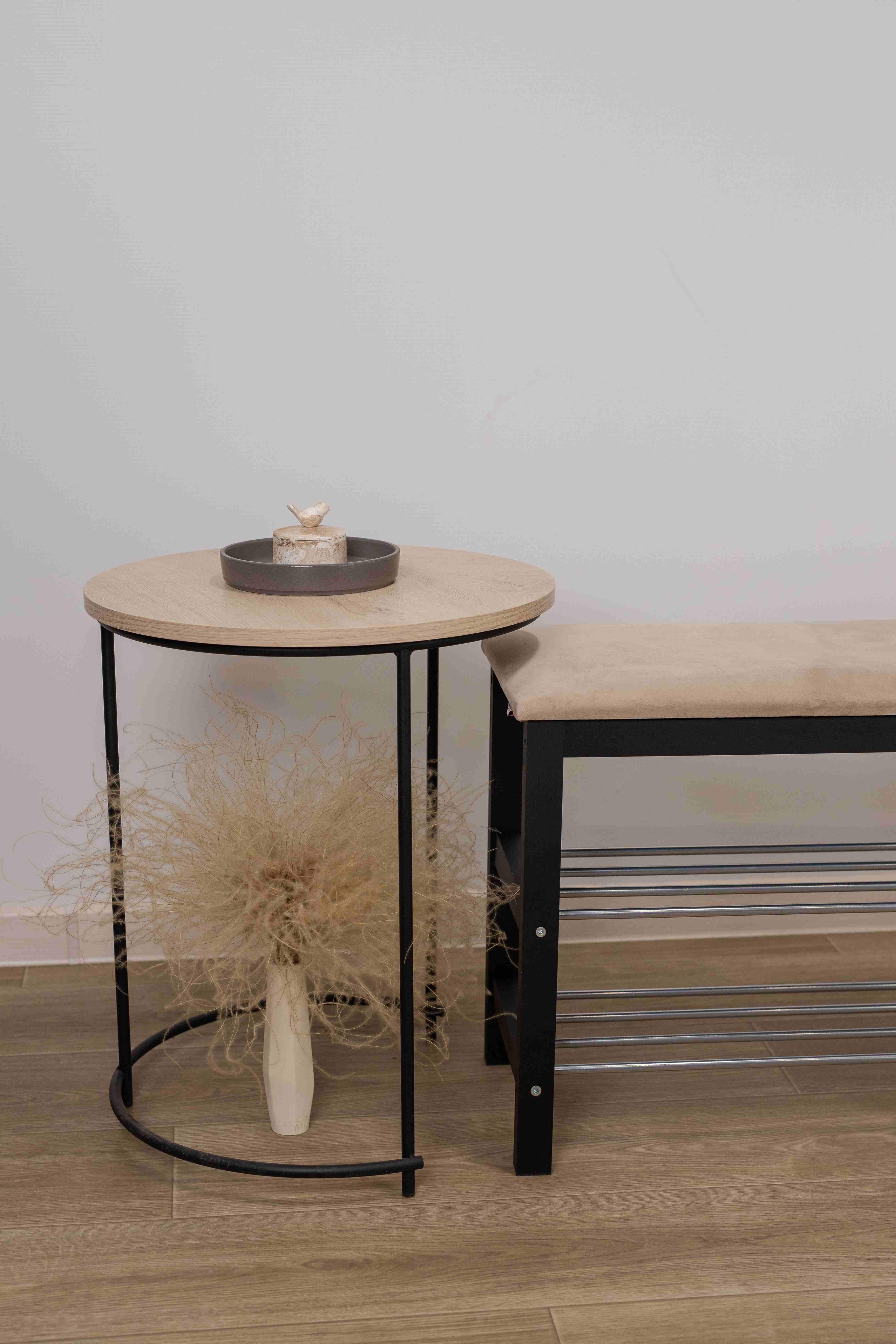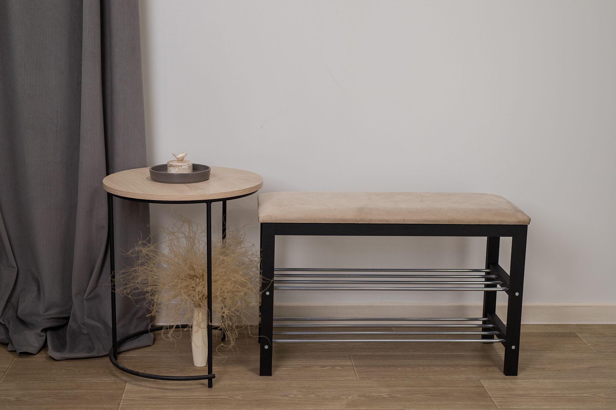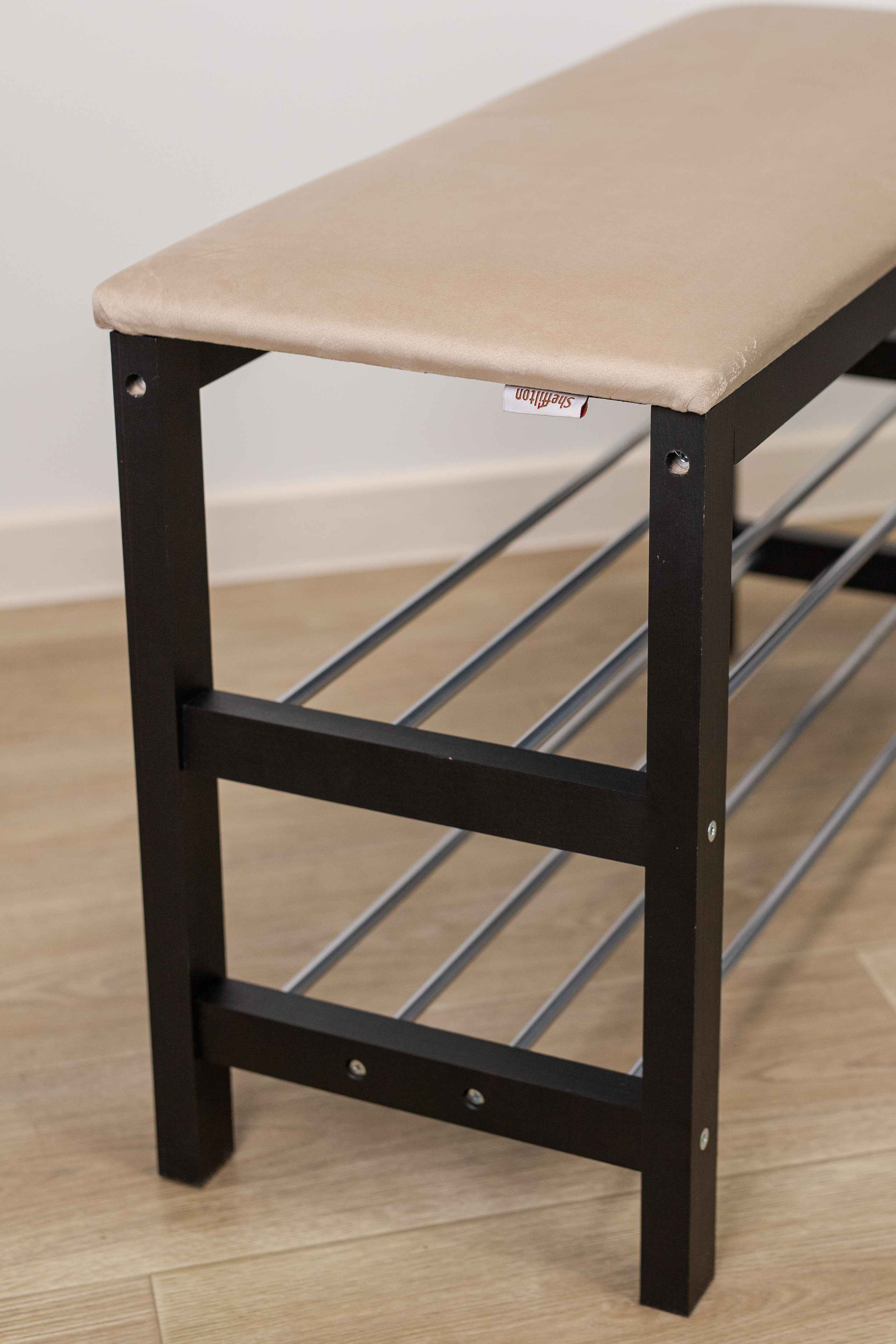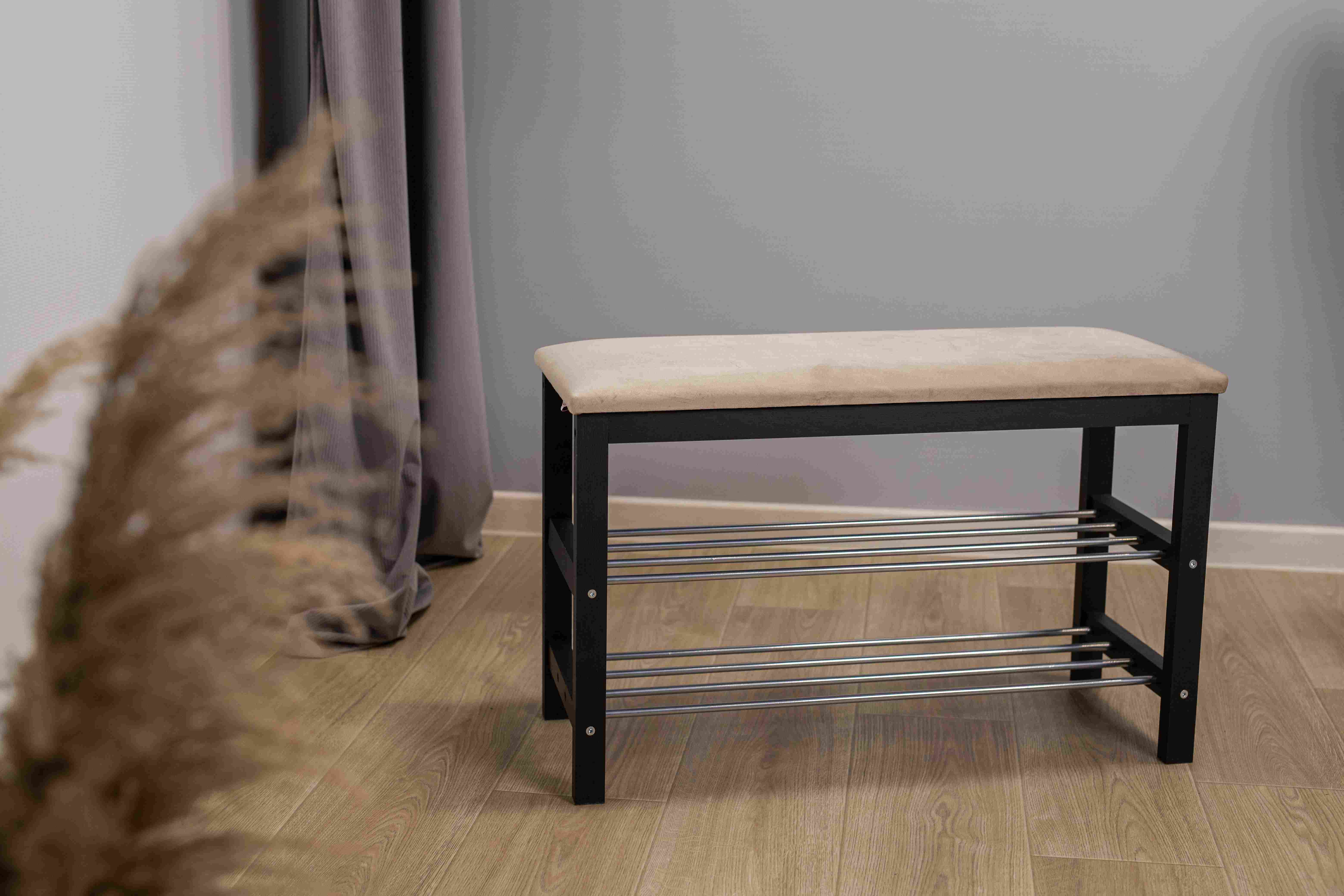 Уютная банкетка с мягким сидением и полками для размещения обуви и тапочек.