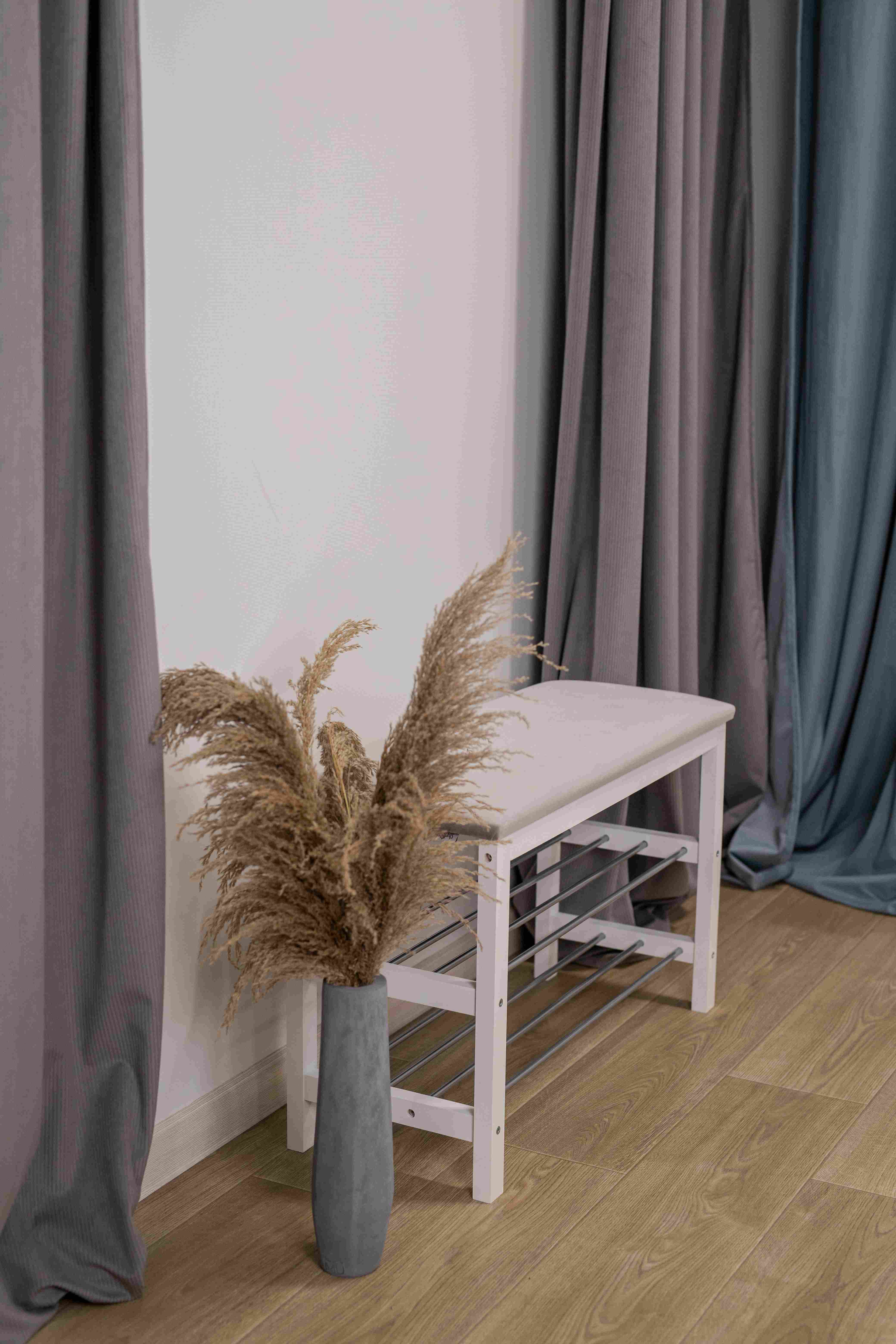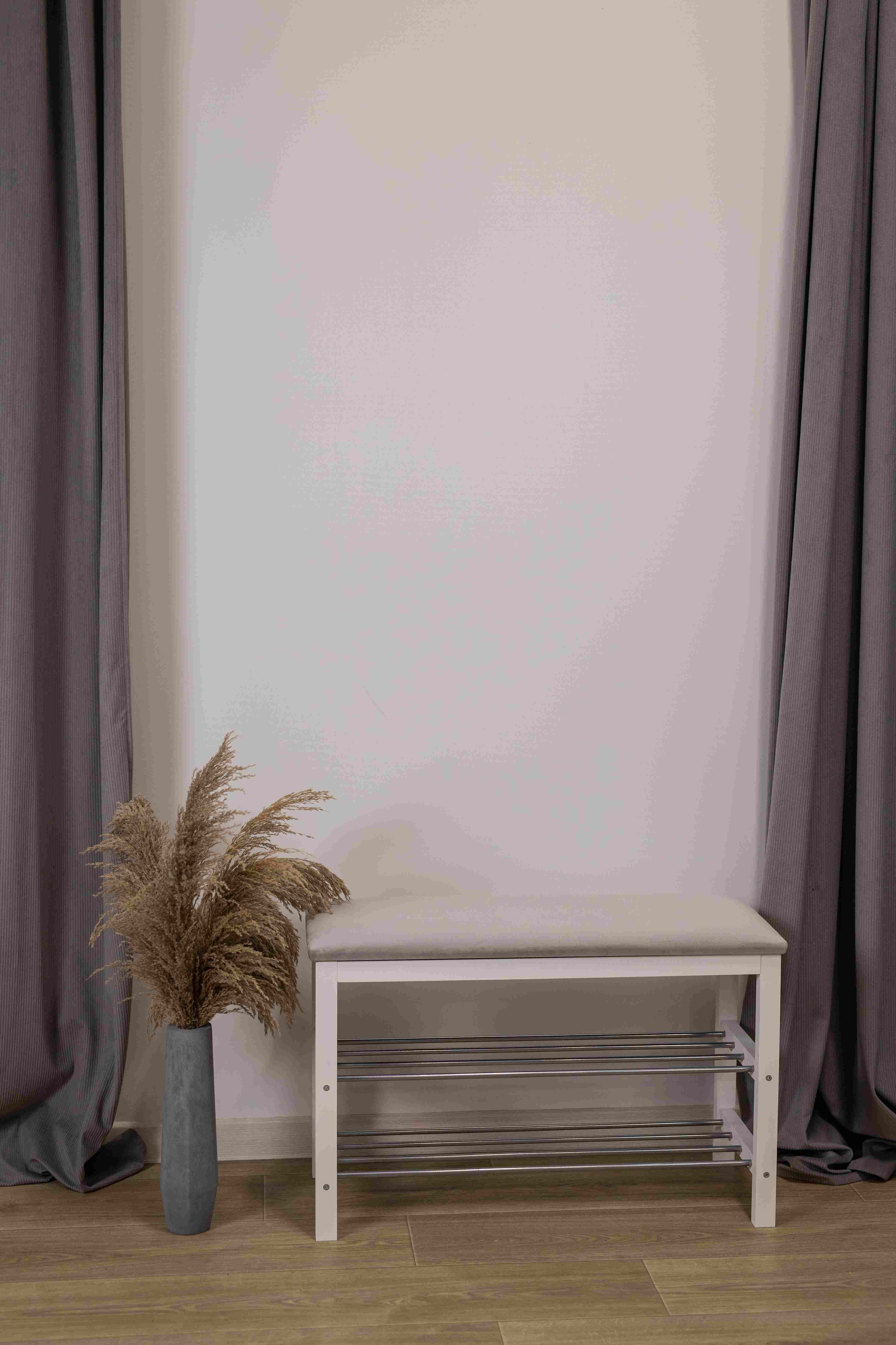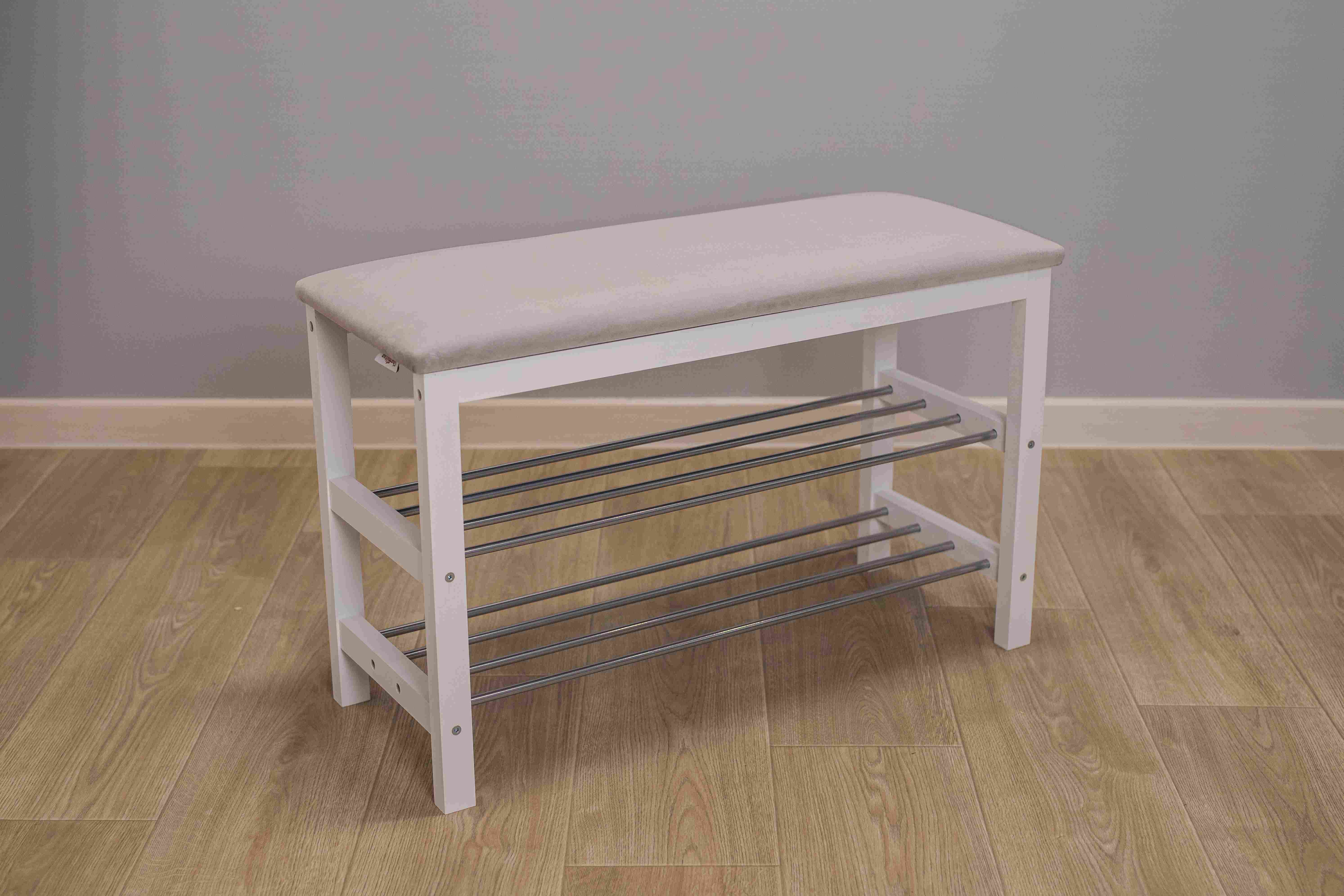 Уютная банкетка с мягким сидением и полками для размещения обуви и тапочек.