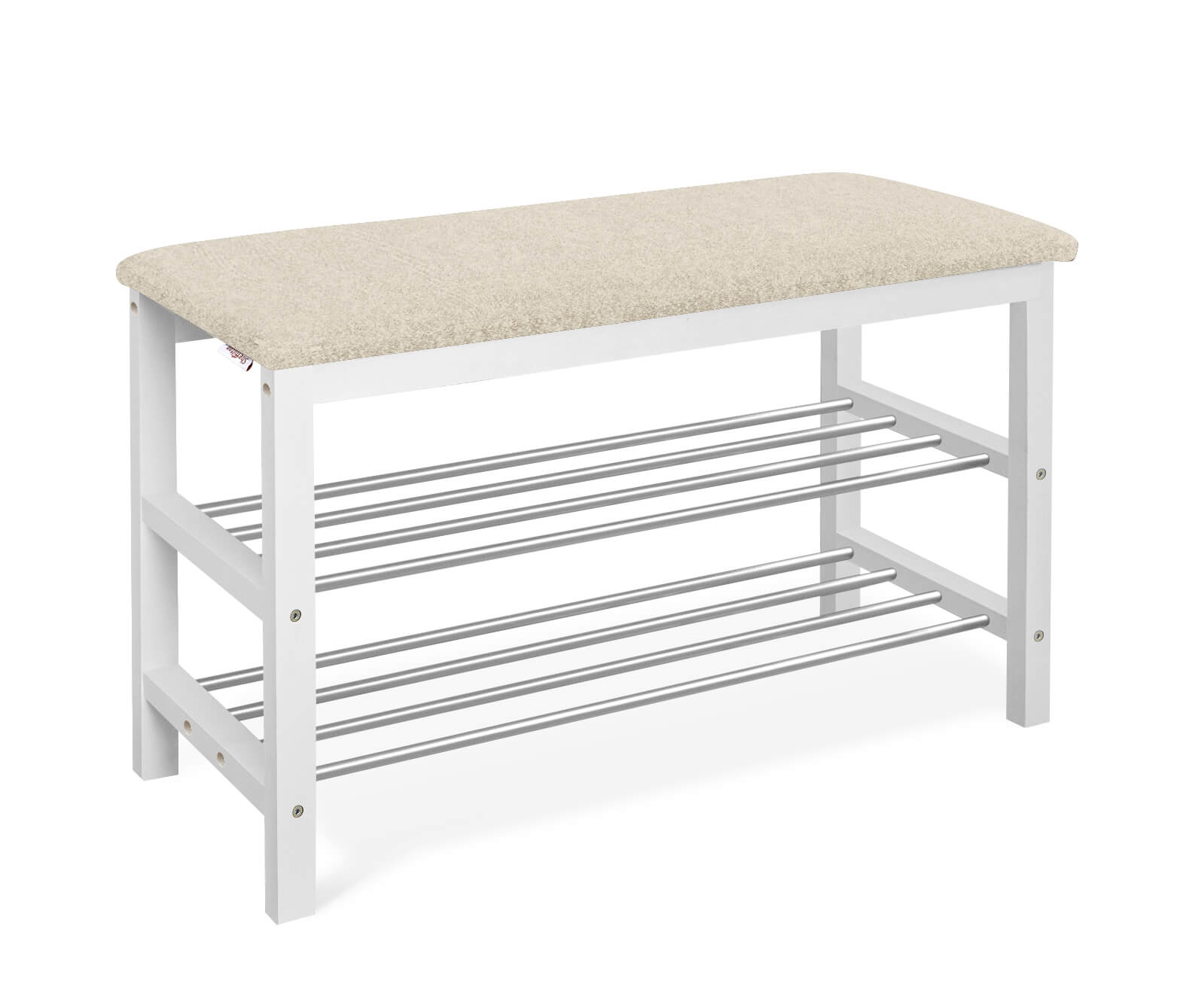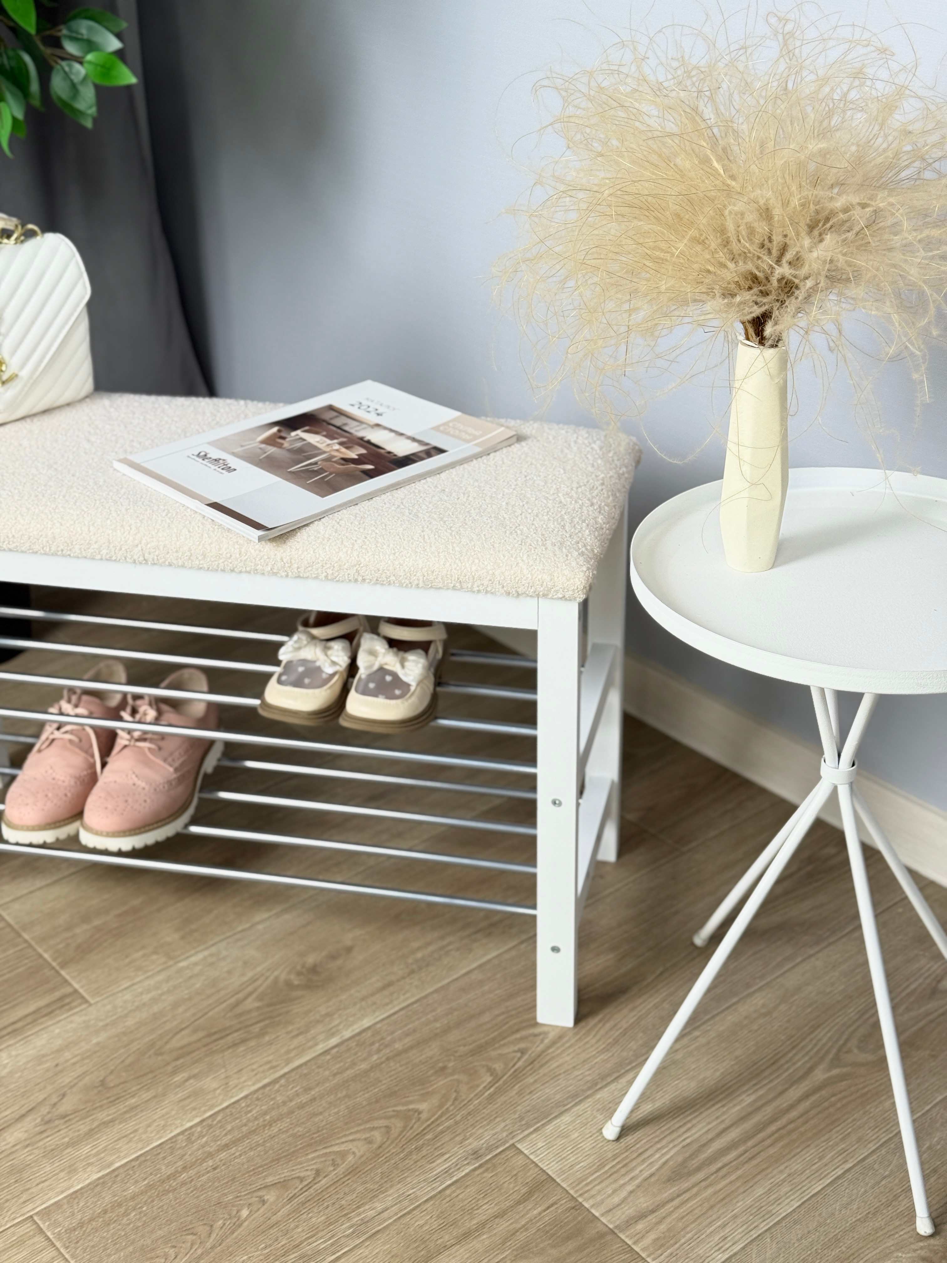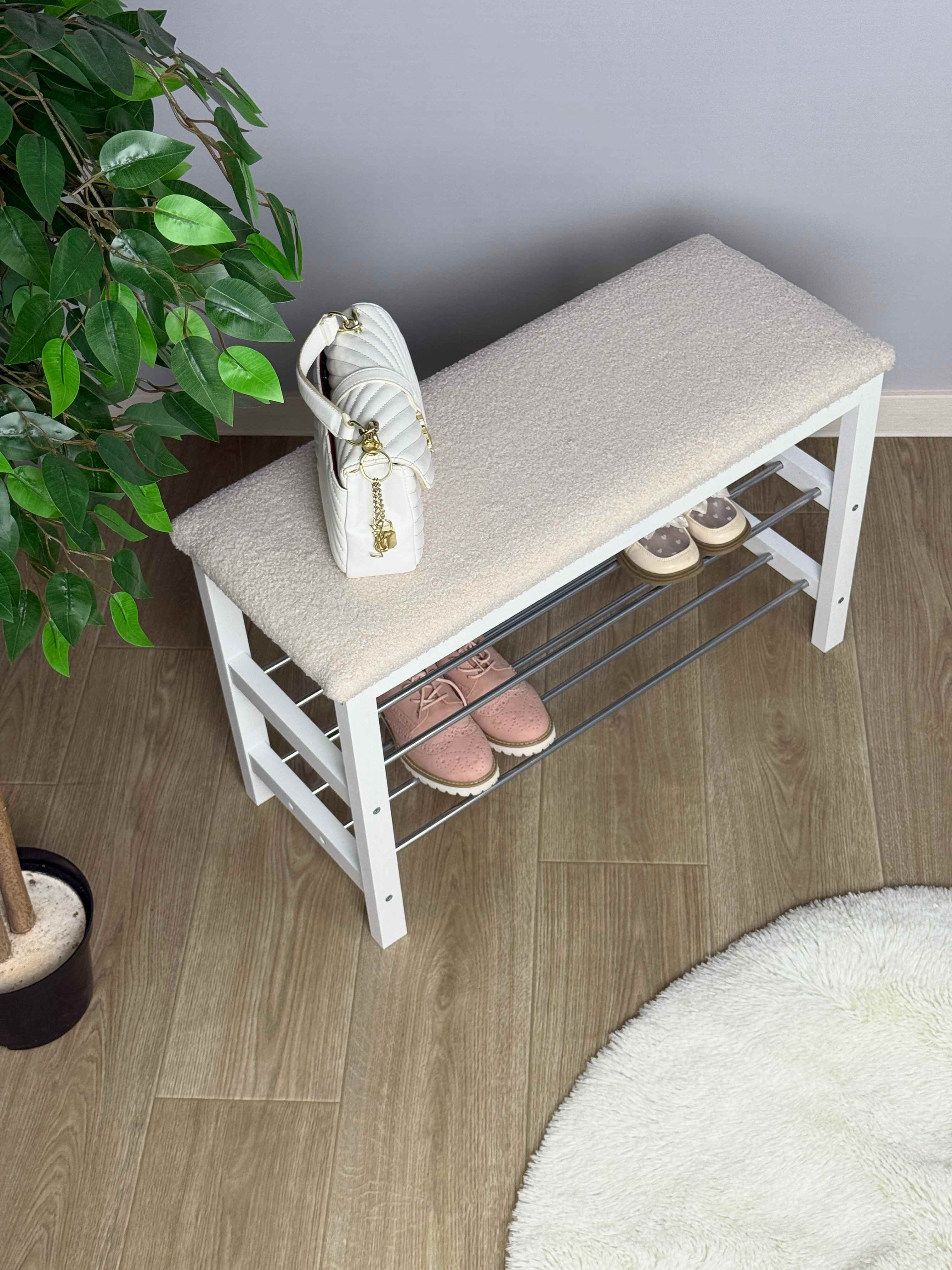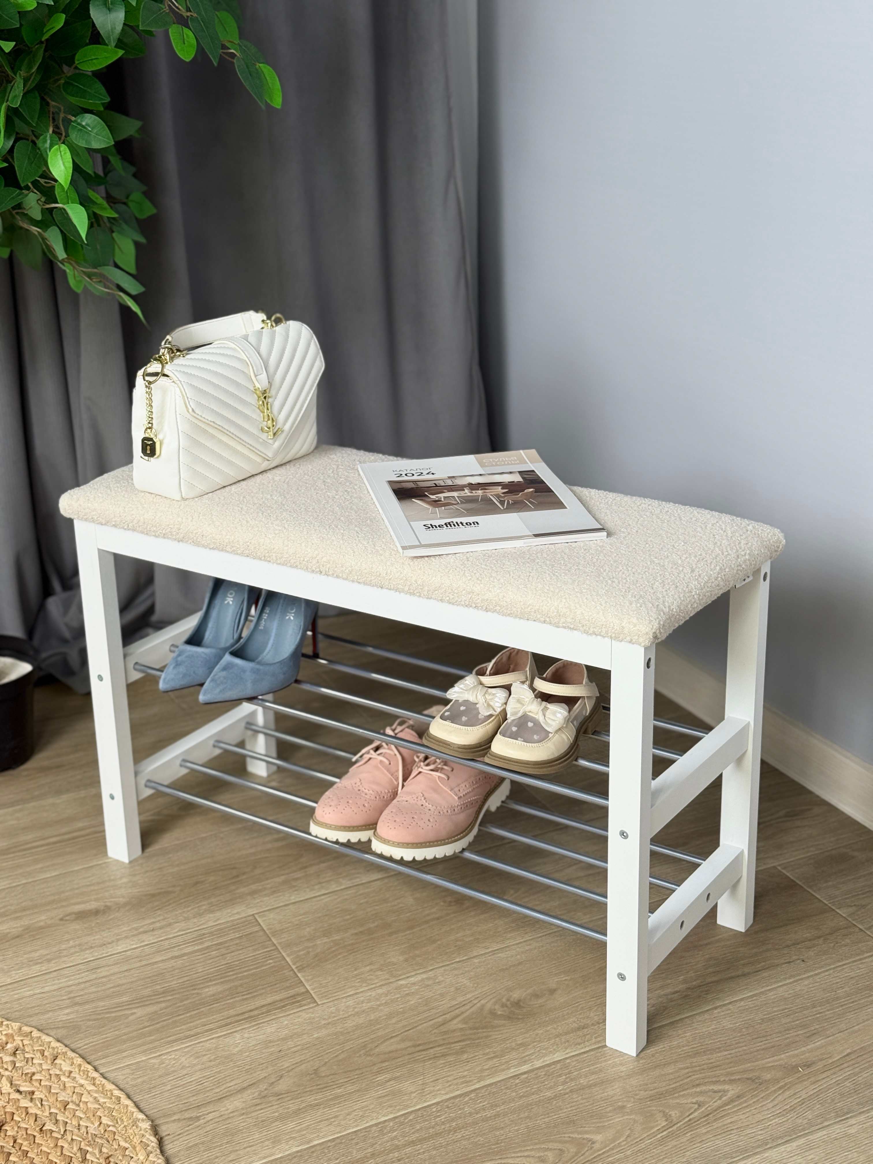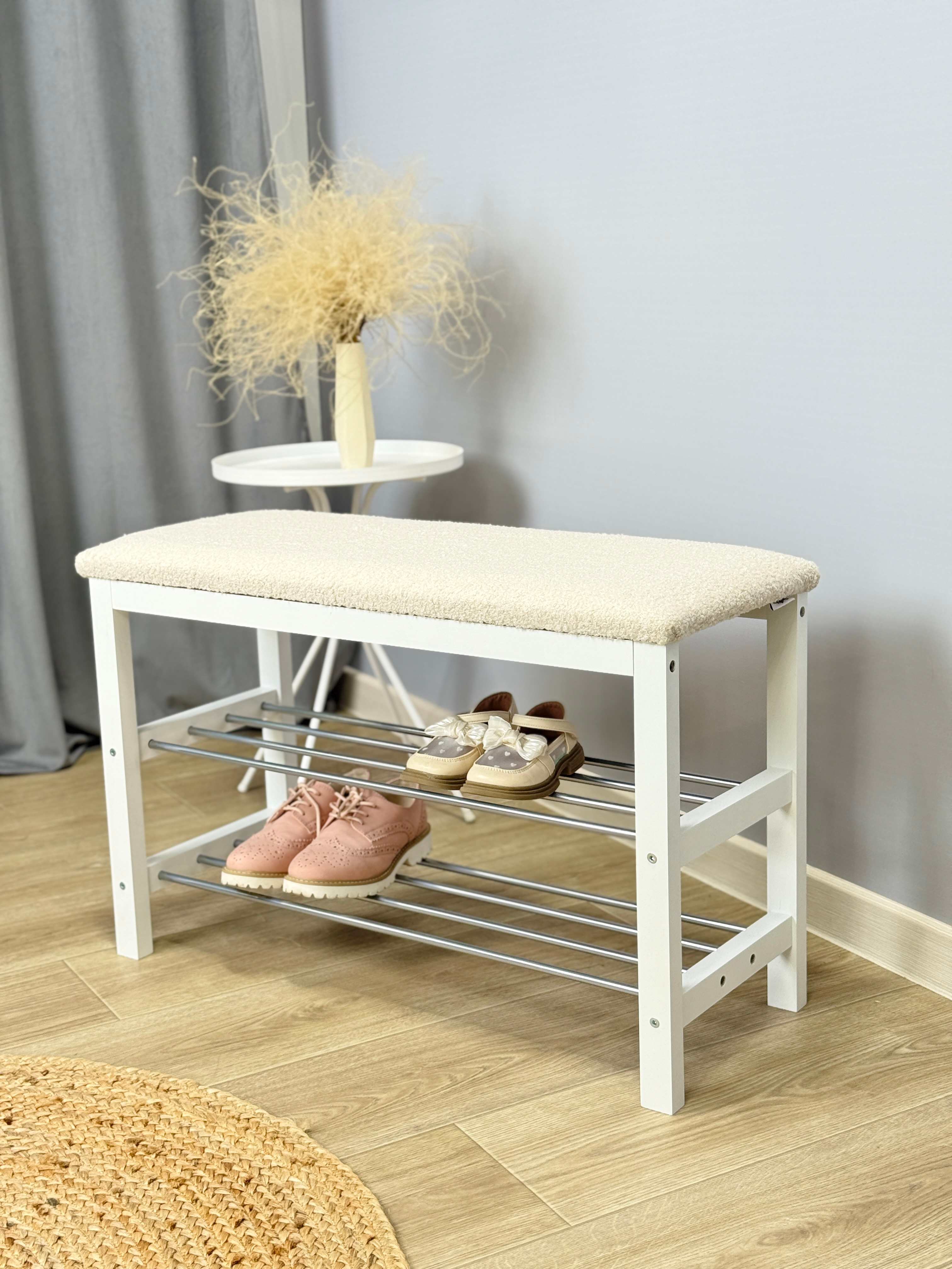 Уютная банкетка с мягким сидением и полками для размещения обуви и тапочек.