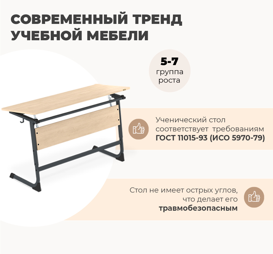 Ученический стол полностью соответствует требованиям ГОСТ 11015-93 (ИСО 5970-79) и занесен в Реестр Минпромторга РФ