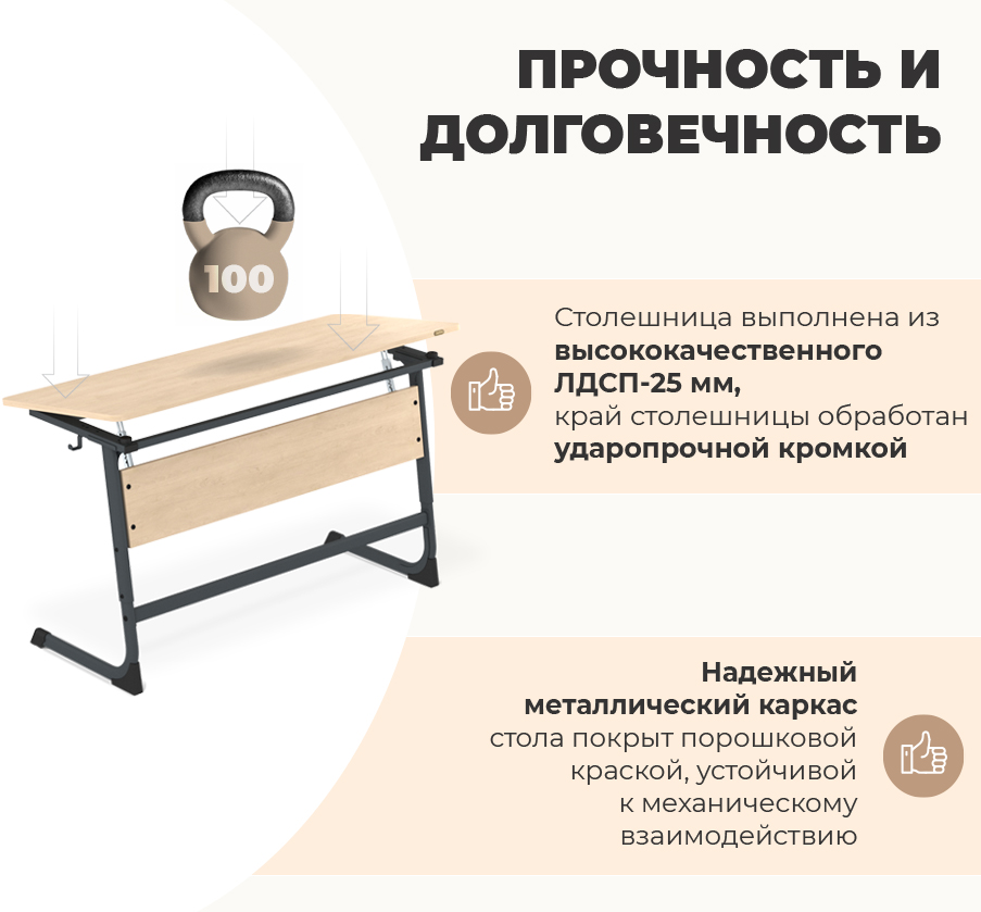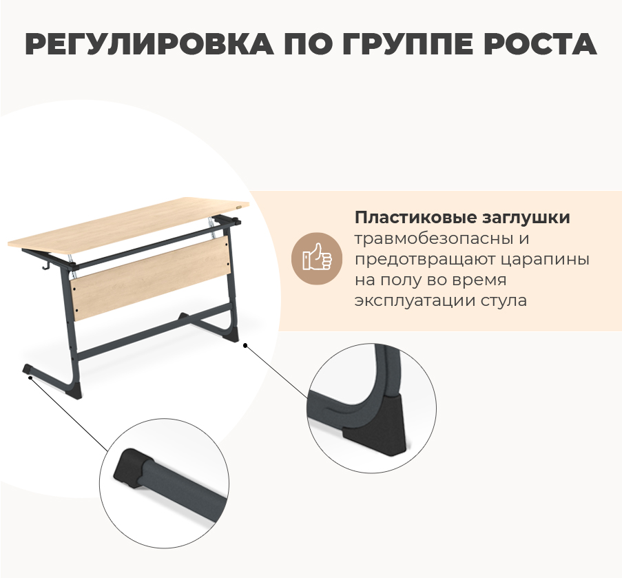 Стол оснащен столешницей с возможностью регулировки угла наклона в диапазоне от 7 до 16 градусов. С легкостью можно настроить положение столешницы под свои индивидуальные предпочтения. Такая функция способствует созданию комфортной рабочей среды, позволяя поддерживать правильную осанку и обеспечивать максимальную концентрацию во время занятий.