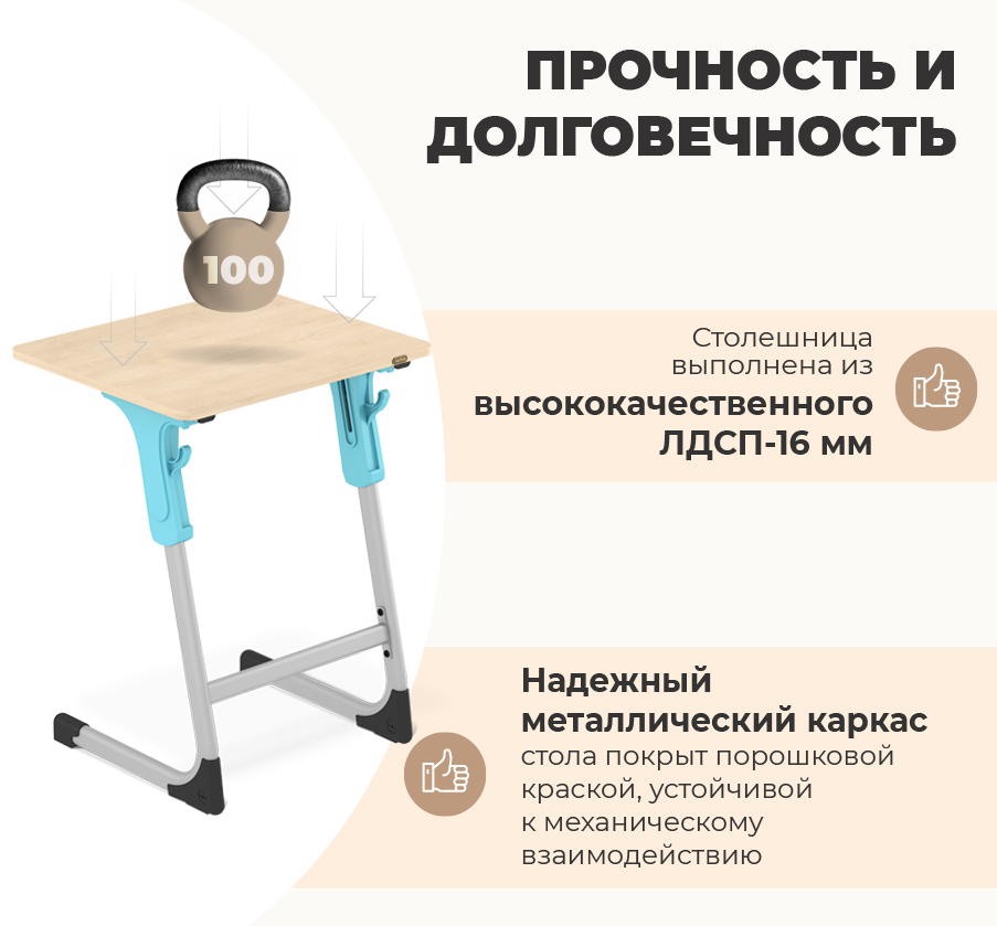 4. Надёжность: Жёсткая конструкция обеспечивает стабильную фиксацию высоты без люфтов и расшатывания, даже при длительной эксплуатации в школьной среде.