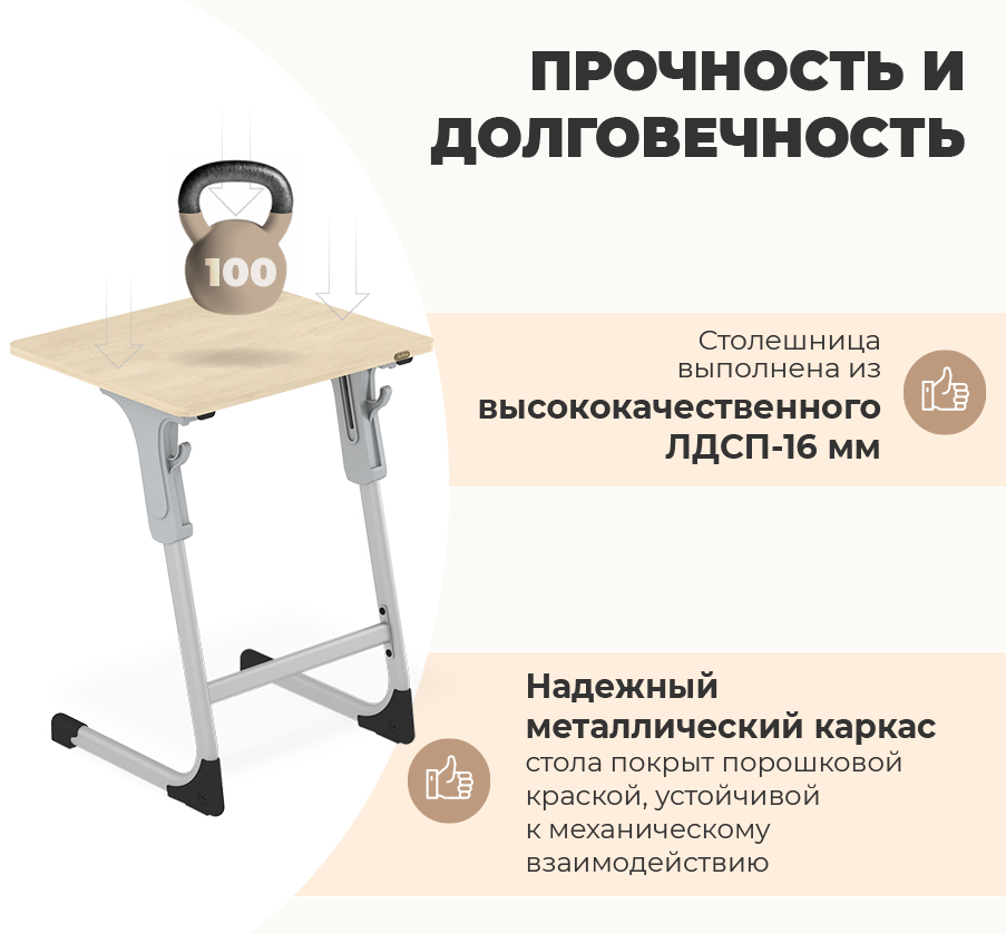 4. Надёжность: Жёсткая конструкция обеспечивает стабильную фиксацию высоты без люфтов и расшатывания, даже при длительной эксплуатации в школьной среде.