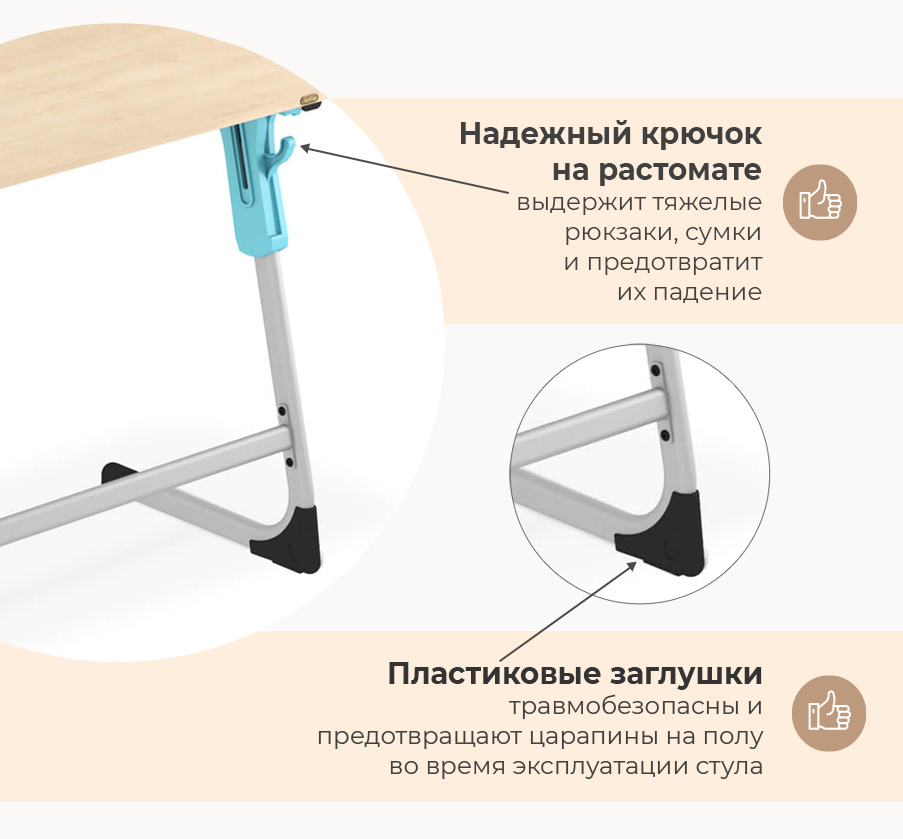 Столешница не имеет острых углов — все углы аккуратно закруглены, что делает ее травмобезопасной. Специальные заглушки каркаса предотвращают царапины на полу во время эксплуатации стула и травмобезопасны.