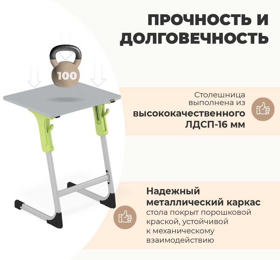 4. Надёжность: Жёсткая конструкция обеспечивает стабильную фиксацию высоты без люфтов и расшатывания, даже при длительной эксплуатации в школьной среде.
