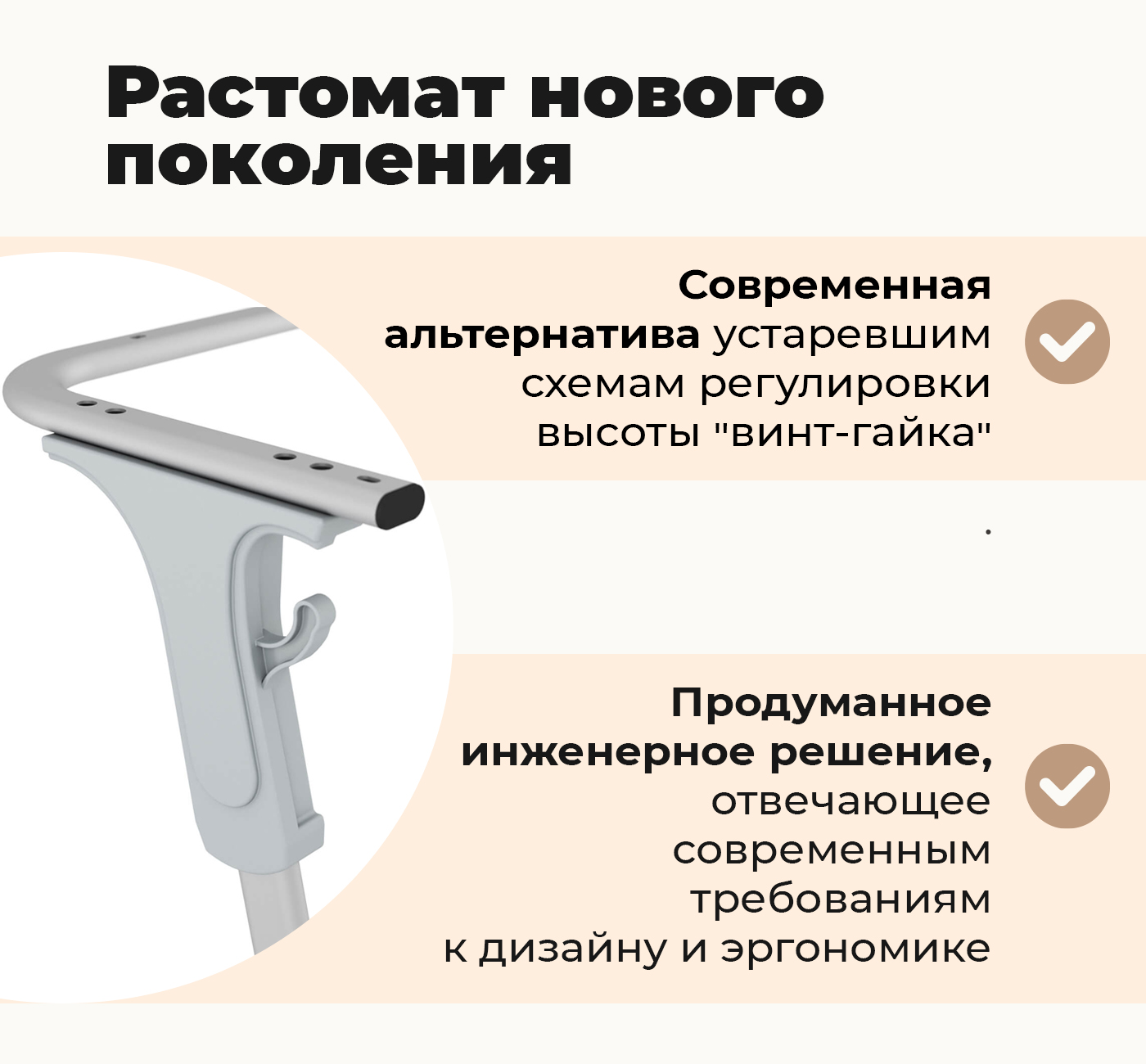 Для регулировки высоты используется растомат нового поколения - современная альтернатива устаревшим схемам регулировки высоты "винт-гайка" — и выигрывает по всем ключевым параметрам: