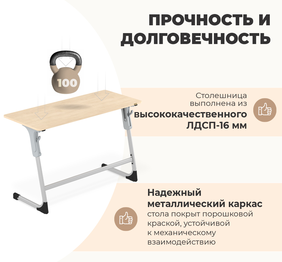 4. Надёжность: Жёсткая конструкция обеспечивает стабильную фиксацию высоты без люфтов и расшатывания, даже при длительной эксплуатации в школьной среде.