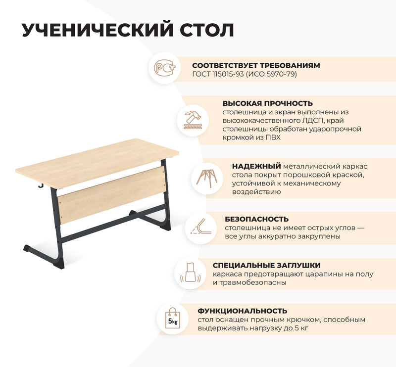 Ученический стол полностью соответствует требованиям ГОСТ 11015-93 (ИСО 5970-79) и занесен в Реестр Минпромторга РФ