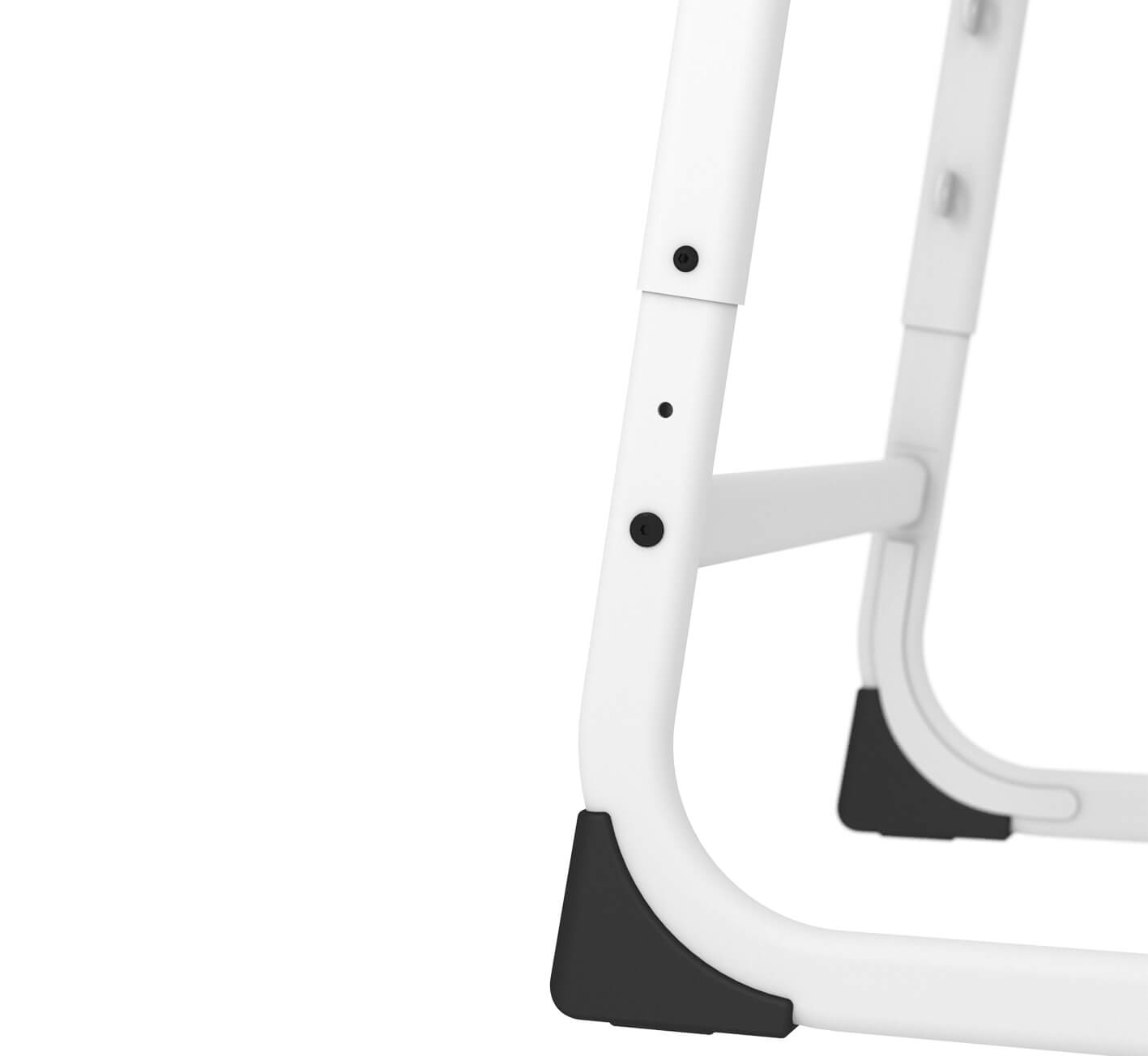 Столешница не имеет острых углов — все углы аккуратно закруглены, что делает ее травмобезопасной. Специальные заглушки каркаса предотвращают царапины на полу во время эксплуатации стула и травмобезопасны.