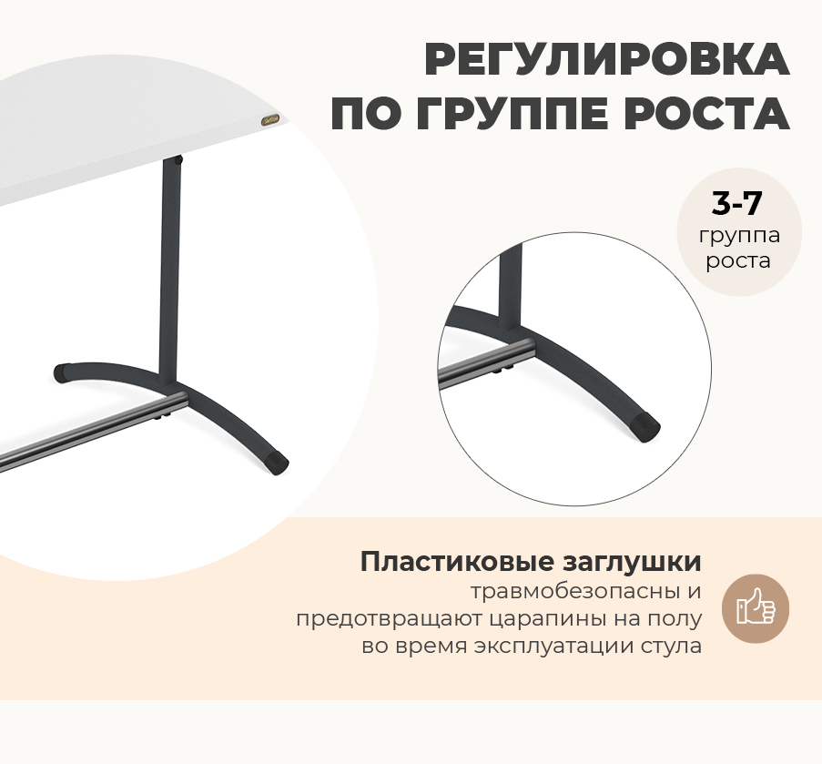Функция регулировки по высоте обеспечивает комфортное положение и поможет в выработке правильной осанки. Регулируются по высоте на 3-7 группы роста.