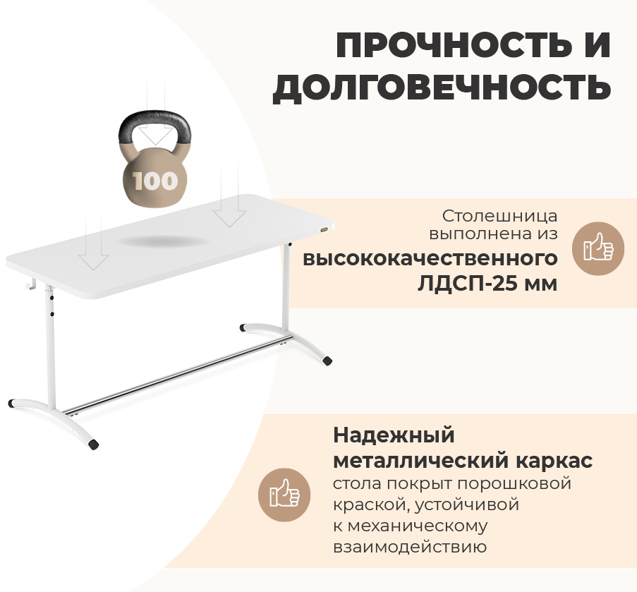 Столешница выполнена из высококачественного ЛДСП 25 мм, край столешницы обработан ударопрочной кромкой из ПВХ. Надежный металлический каркас стола покрыт порошковой краской, устойчивой к механическому воздействию, что гарантирует долговечность использования.