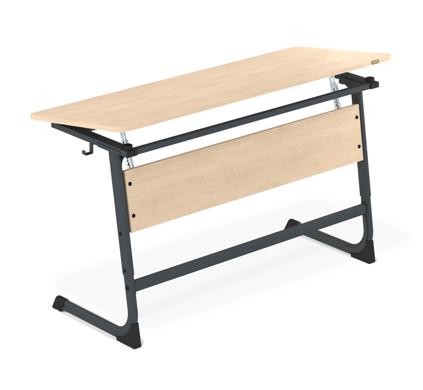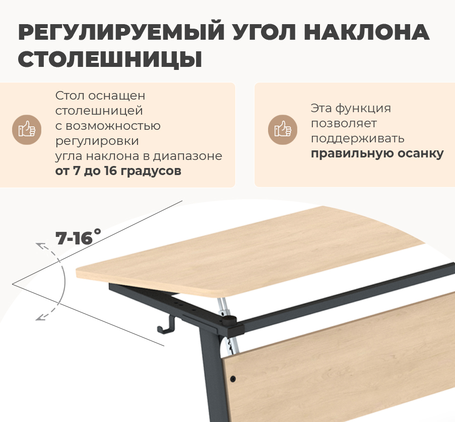Стол оснащен столешницей с возможностью регулировки угла наклона в диапазоне от 7 до 16 градусов. С легкостью можно настроить положение столешницы под свои индивидуальные предпочтения. Такая функция способствует созданию комфортной рабочей среды, позволяя поддерживать правильную осанку и обеспечивать максимальную концентрацию во время занятий.