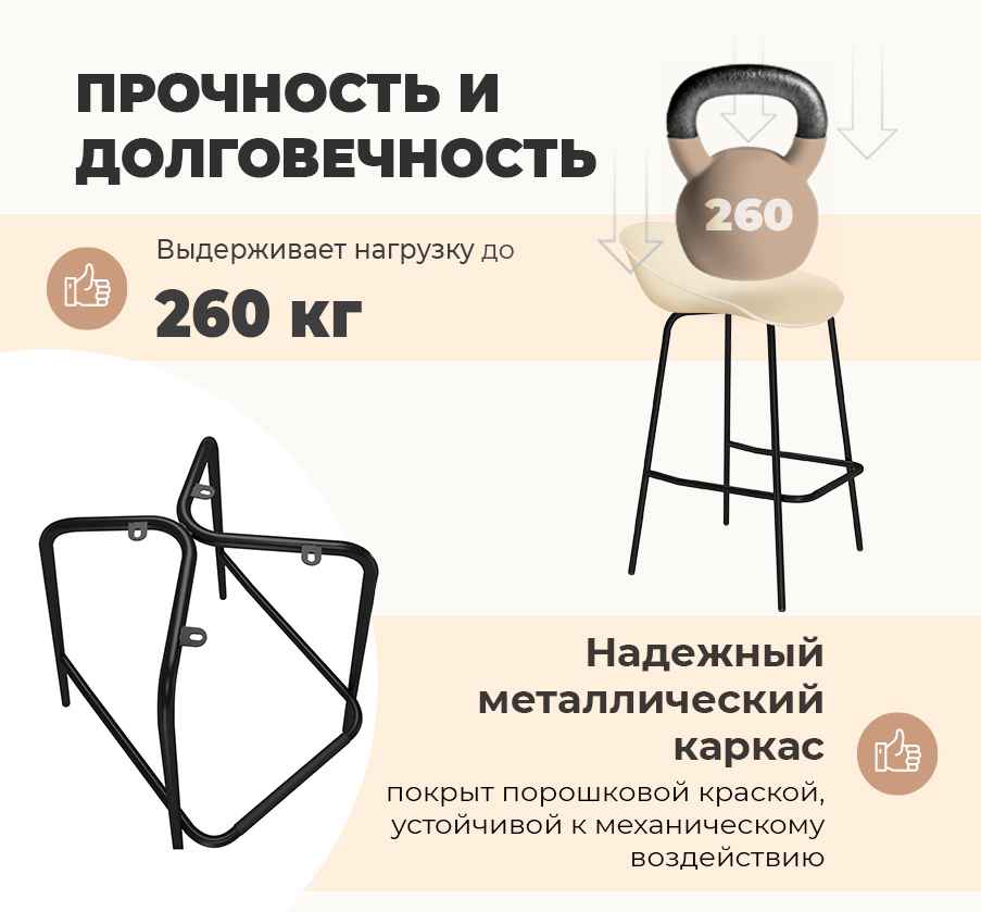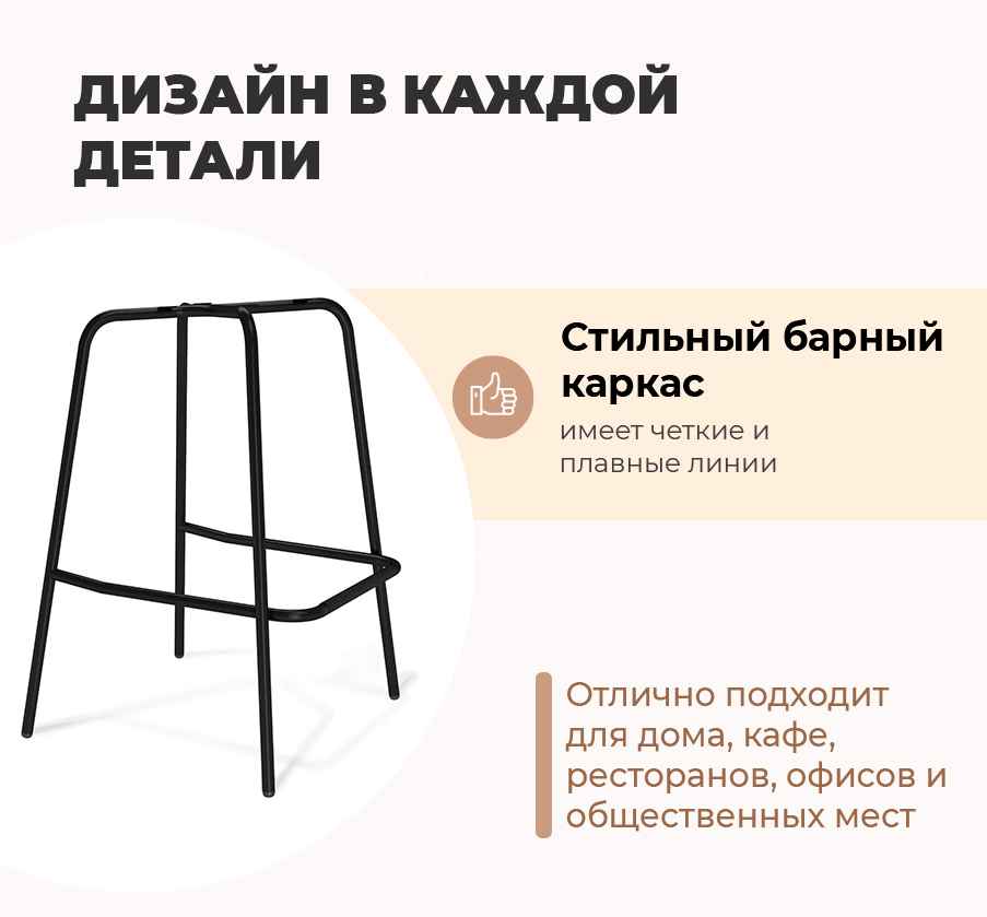 Барный каркас выполнен из металлической трубы диаметром 20 мм и толщиной 1,5 мм. Сиденье крепится к каркасу с помощью приваренных фланцев, что обеспечивает дополнительную прочность и не нарушает целостность металлической конструкции. Поверхность каркаса покрыта порошковой краской, устойчивой к механическому воздействию.