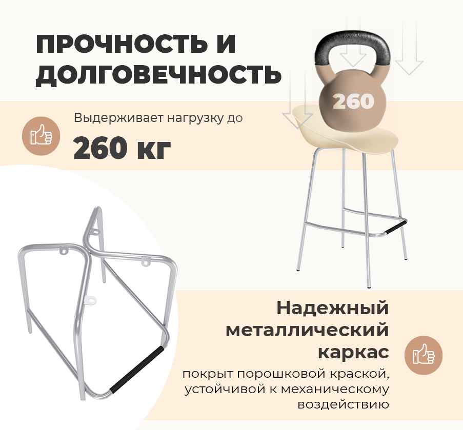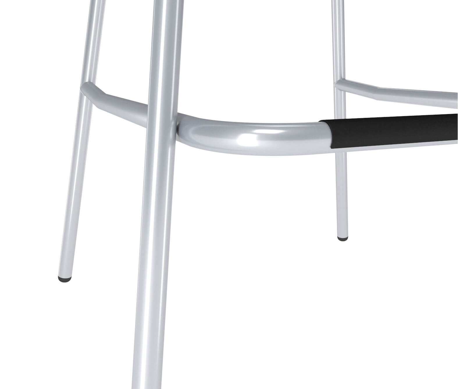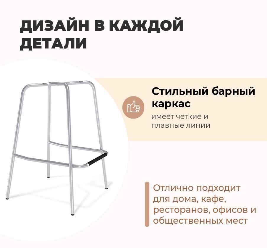 Барный каркас выполнен из металлической трубы диаметром 20 мм и толщиной 1,5 мм. Сиденье крепится к каркасу с помощью приваренных фланцев, что обеспечивает дополнительную прочность и не нарушает целостность металлической конструкции. Поверхность каркаса покрыта порошковой краской, устойчивой к механическому воздействию.