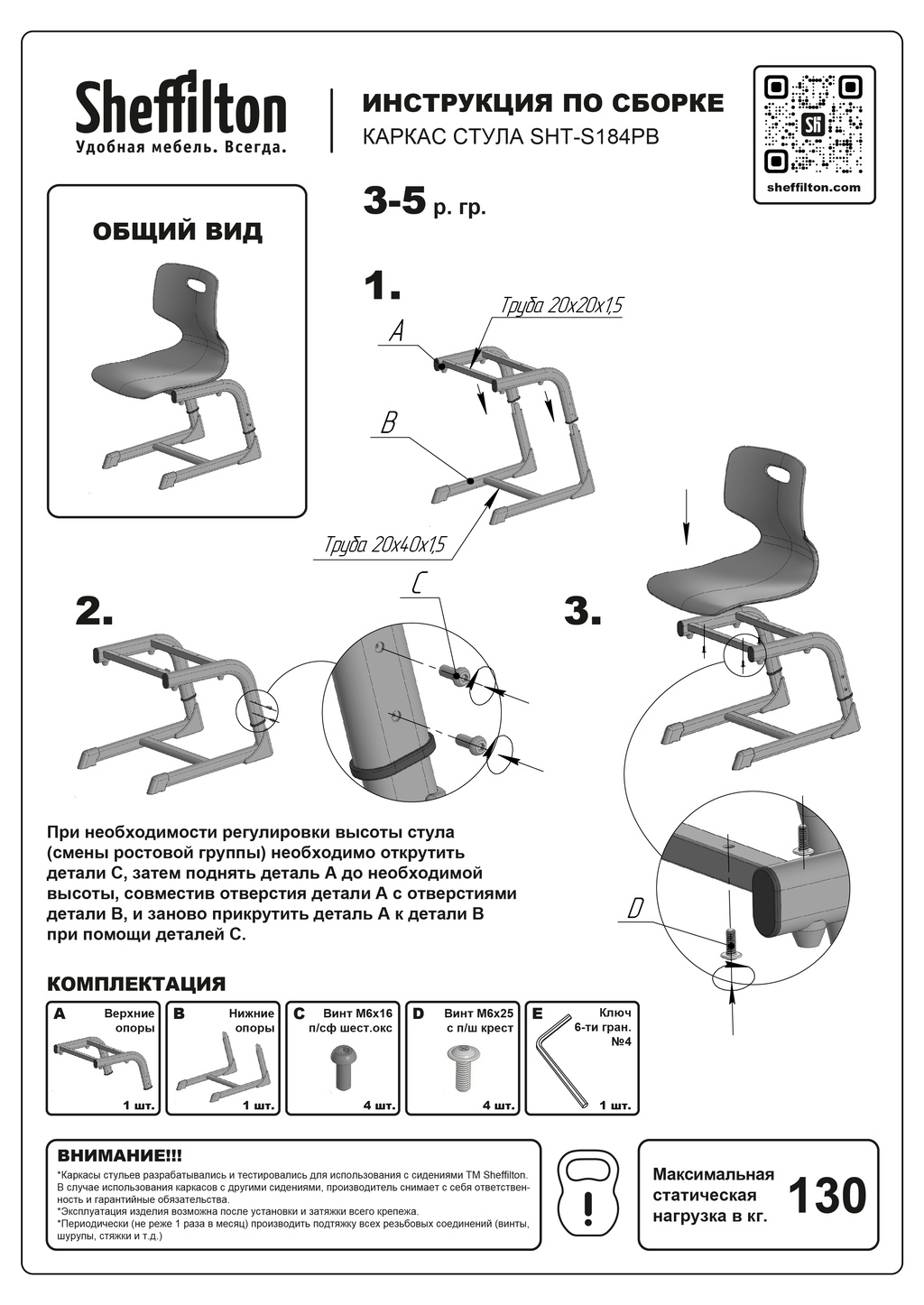 Внимание!!! Каркасы стульев разрабатывались и тестировались для использования с сидениями ТМ Sheffilton. В случае использования каркасов с другими сиденmями, производитель снимает с себя ответственность и гарантийные обязательства.