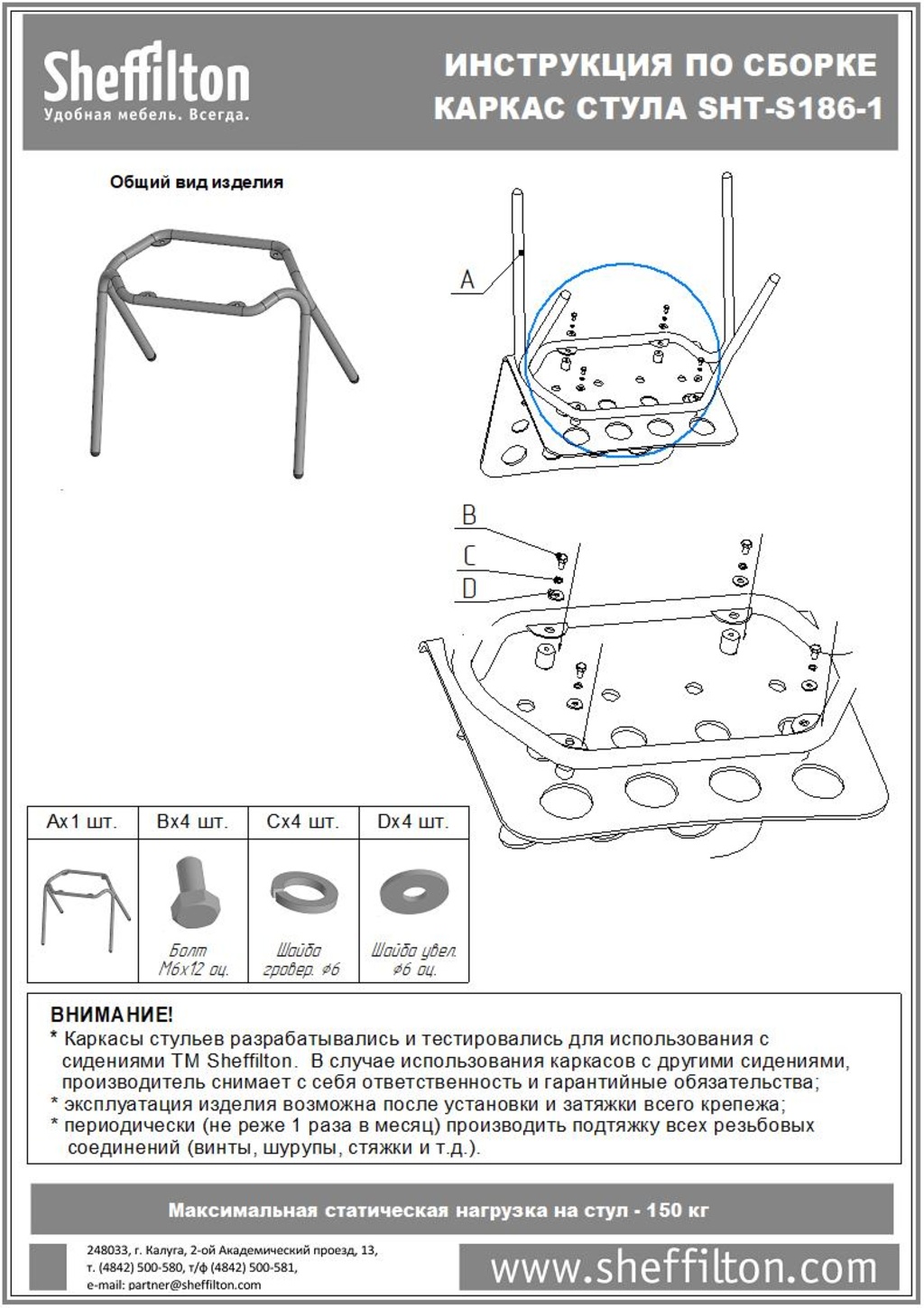 Внимание!!! Каркасы стульев разрабатывались и тестировались для использования с сидениями ТМ Sheffilton. В случае использования каркасов с другими сидениями, производитель снимает с себя ответственность и гарантийные обязательства.