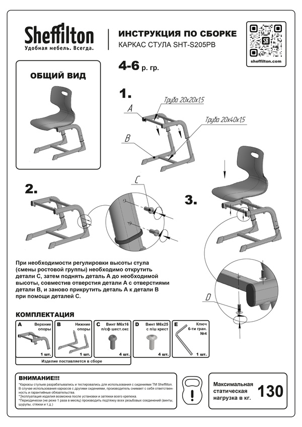 Внимание!!! Каркасы стульев разрабатывались и тестировались для использования с сидениями ТМ Sheffilton. В случае использования каркасов с другими сиденmями, производитель снимает с себя ответственность и гарантийные обязательства.