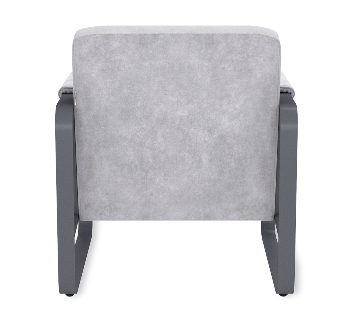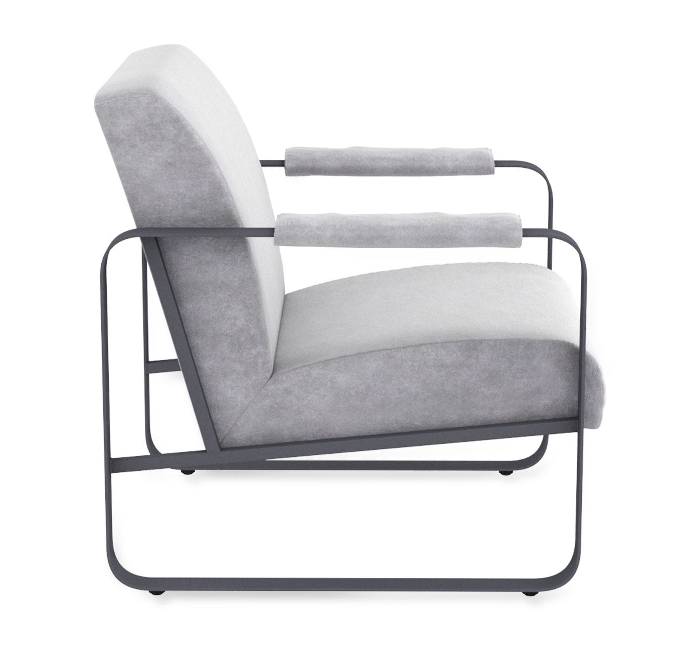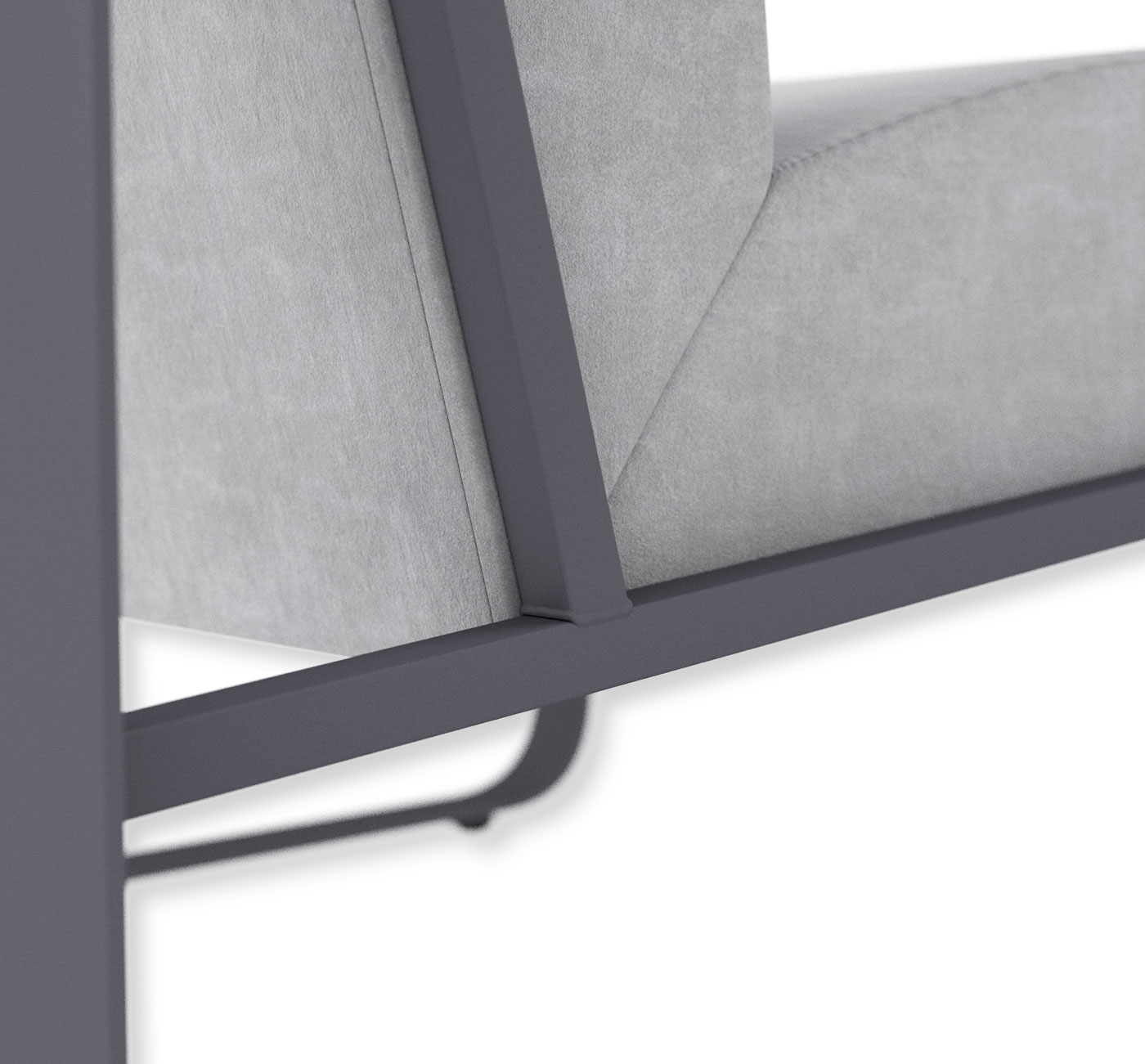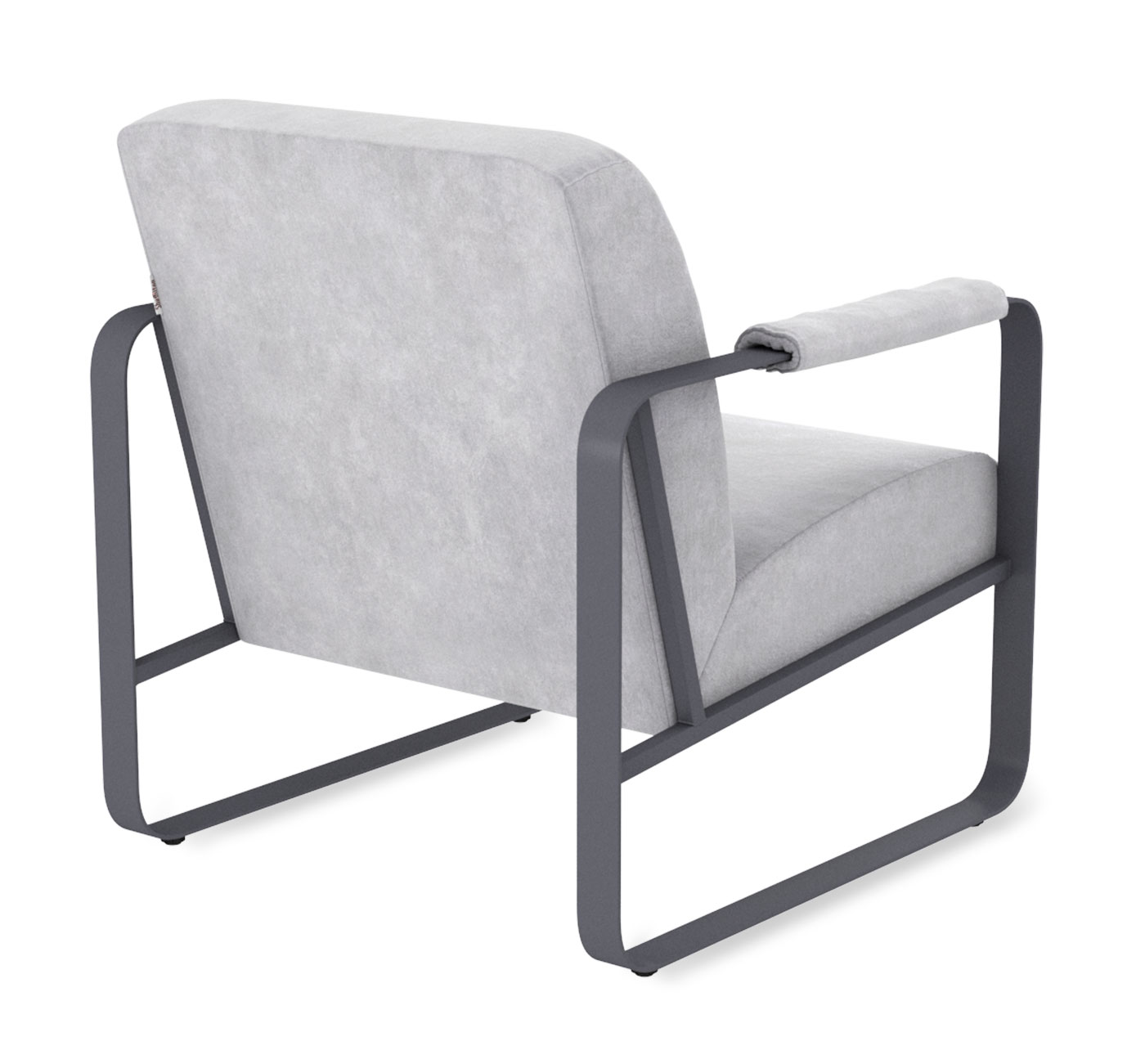 Дизайн модели основан на выдержанной цветовой гамме и небольшой высоте – все это помогает создать располагающую обстановку к отдыху, расслаблению или приятной неформальной беседе. Невысокая спинка отходит от сидения под небольшим углом, что делает кресло еще более удобным. Стильные, мягкие, практически одинаковые по форме и размеру комфортабельные подушки обиты микровелюром. Каркас выполнен из металлического листа, поэтому сбоку кресло выглядит абсолютно невесомым. Ножки плавно переходят в подлокотники и спинку.