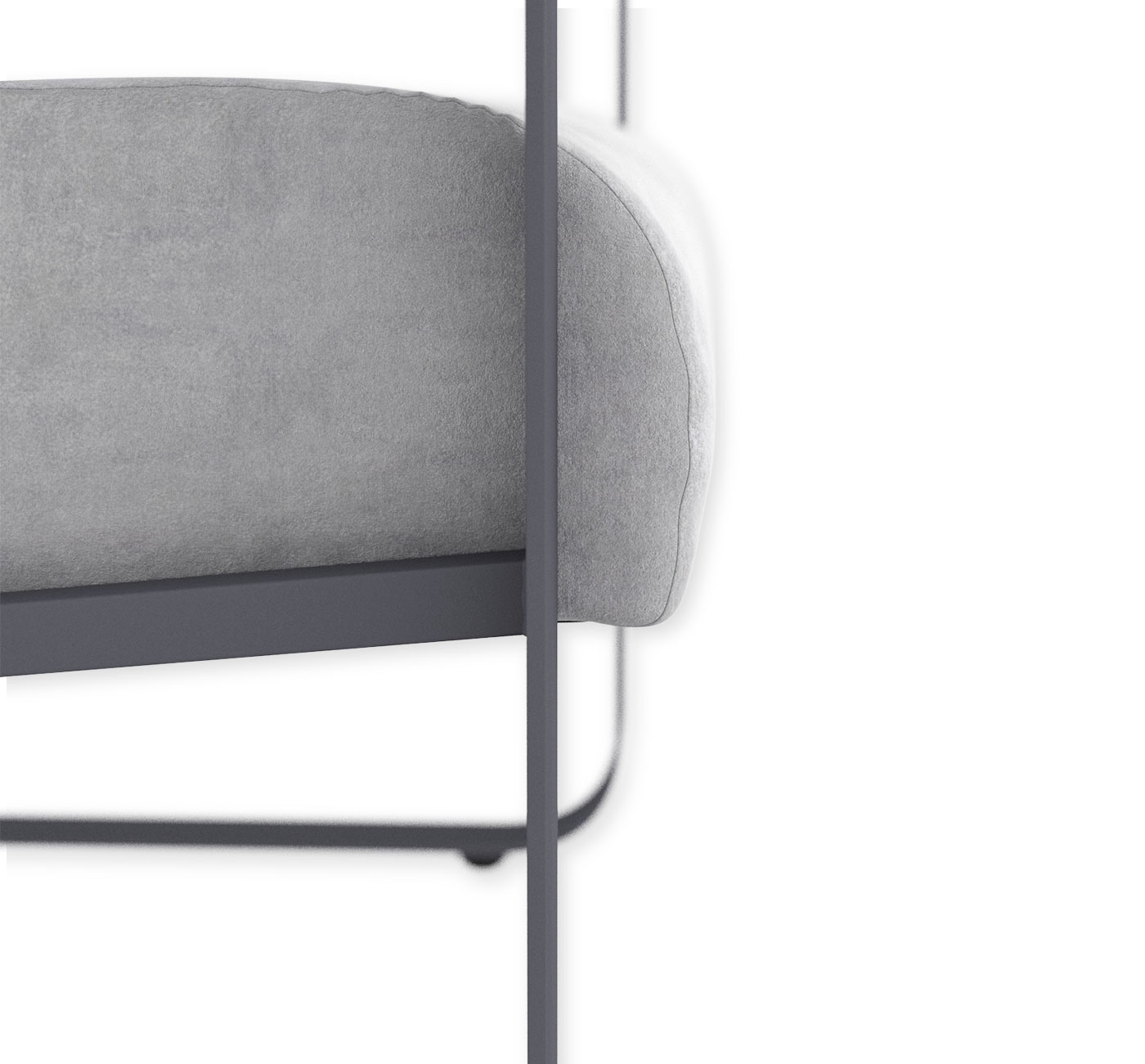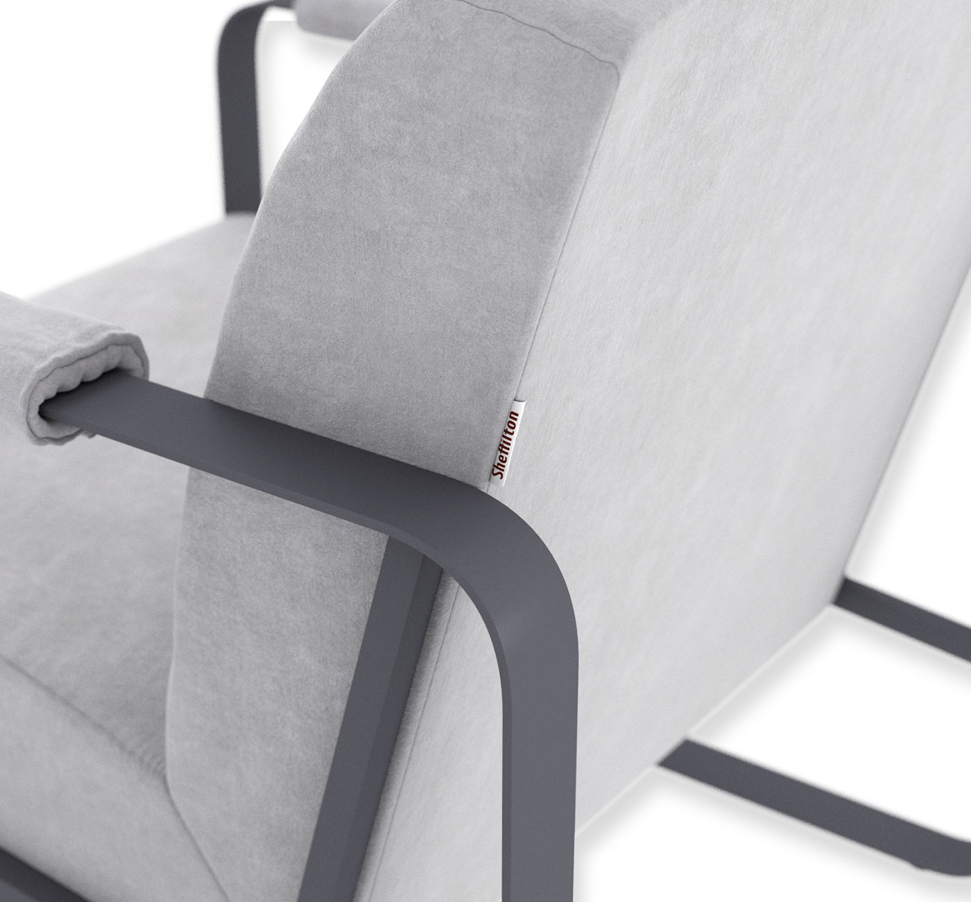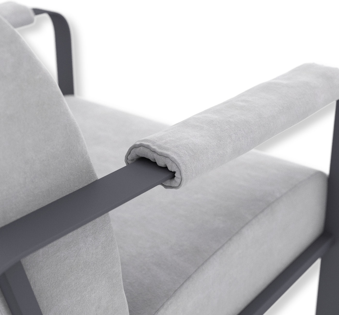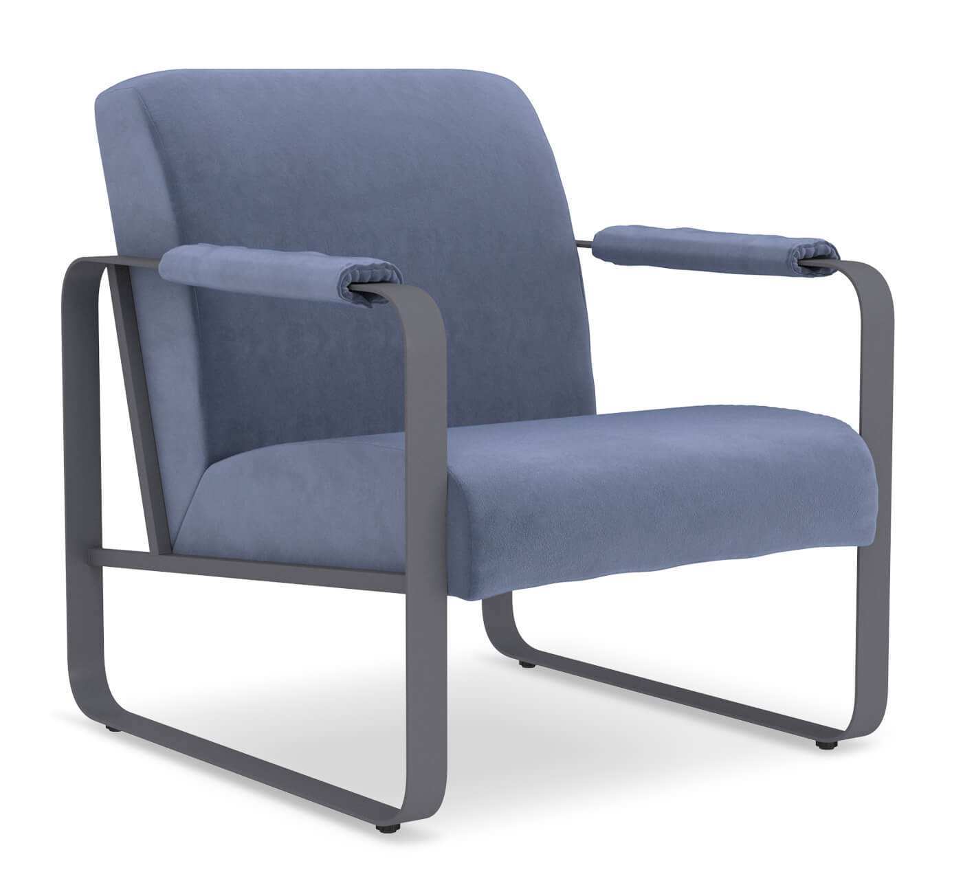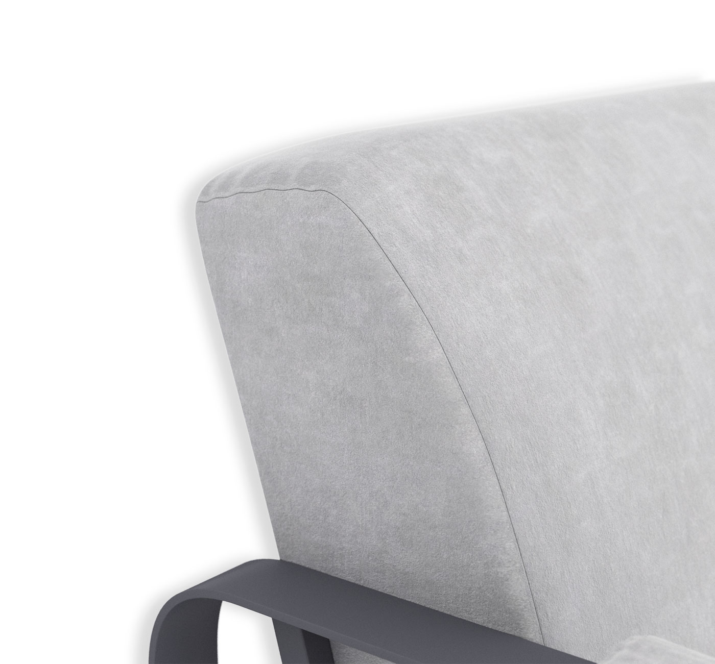 Дизайн модели основан на выдержанной цветовой гамме и небольшой высоте – все это помогает создать располагающую обстановку к отдыху, расслаблению или приятной неформальной беседе. Невысокая спинка отходит от сидения под небольшим углом, что делает кресло еще более удобным. Стильные, мягкие, практически одинаковые по форме и размеру комфортабельные подушки обиты микровелюром. Каркас выполнен из металлического листа, поэтому сбоку кресло выглядит абсолютно невесомым. Ножки плавно переходят в подлокотники и спинку.