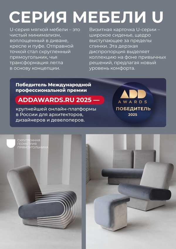 Кресло U SHT-AMS10 — это минимализм, доведённый до совершенства. Идея серии дизайнерской мебели U рождается из простой геометрии: скруглённый прямоугольник, трансформированный в мягкую, визуально невесомую форму.