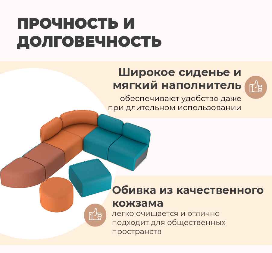 Вы можете собрать модульный диван, комбинируя прямые, угловые и круглые модули. Это позволяет создать удобную зону отдыха, адаптированную под любое пространство.