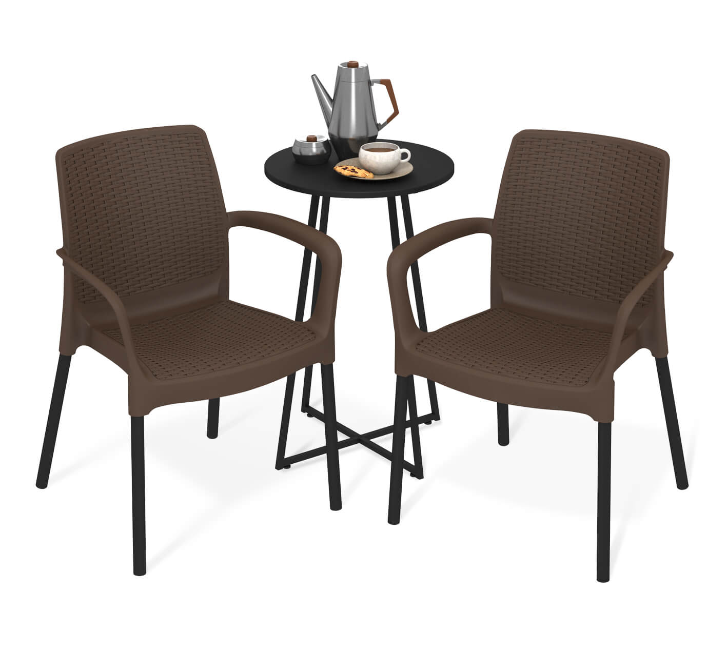 Компактный стол и два удобных стула создают гармоничное пространство для завтраков, кофе-пауз и неспешных бесед. Комплект легко впишется в интерьер кафе, террасы, коворкинга или в домашний интерьер.