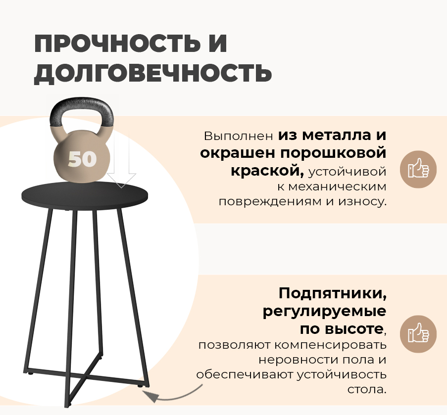 Стол оснащён подпятниками, регулируемыми по высоте. Они компенсируют неровности пола, обеспечивают устойчивость конструкции и защищают напольное покрытие от царапин.