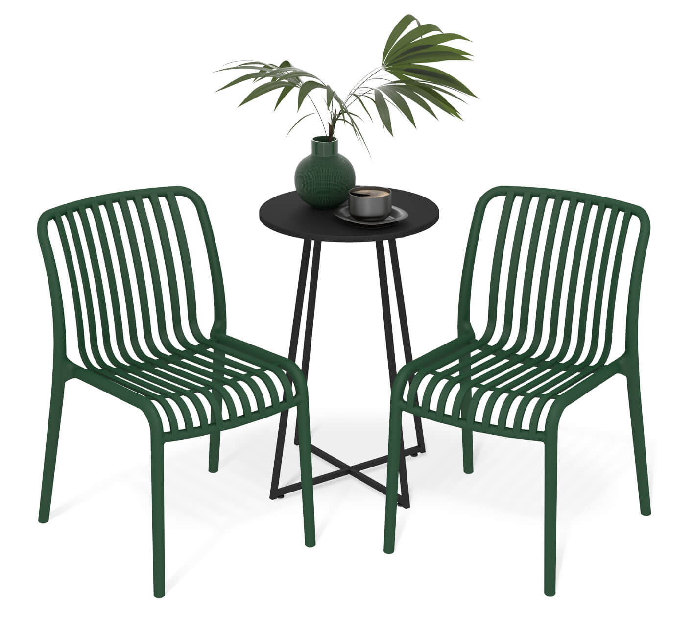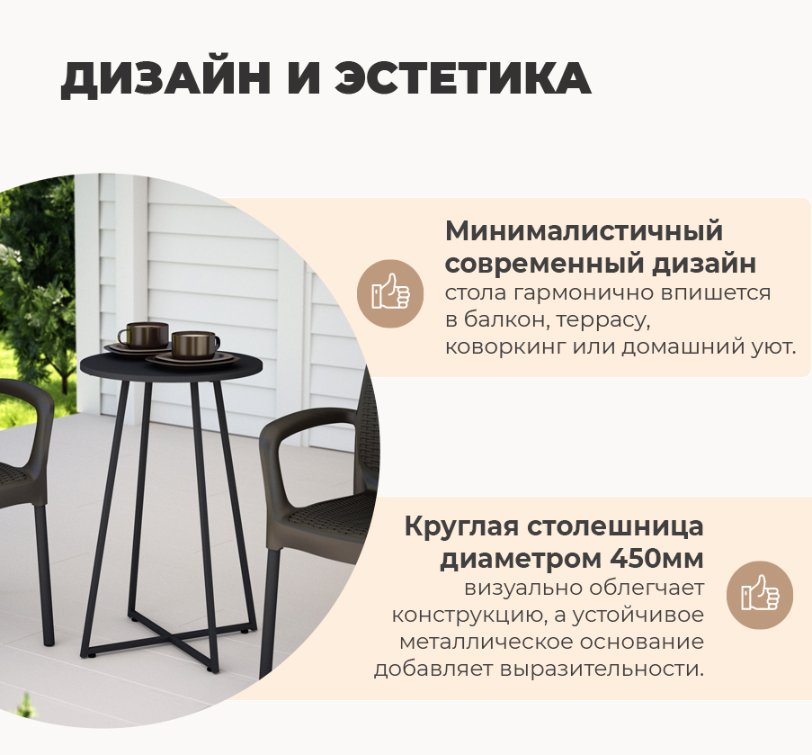 Компактный стол и стулья создают гармоничное пространство для завтраков, кофе-пауз и неспешных бесед. Комплект органично впишется в интерьер кафе, террасы, коворкинга или станет стильным акцентом в домашнем пространстве.