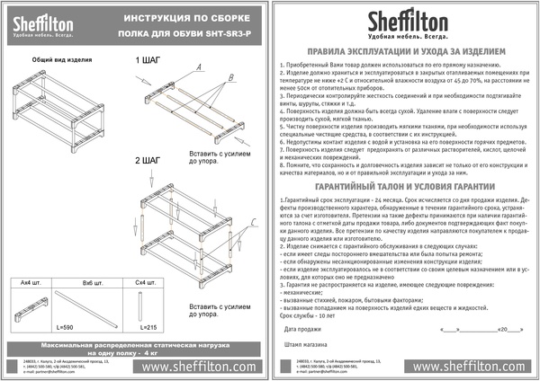- Максимальная распределенная статическая нагрузка на одну полку 4 кг;