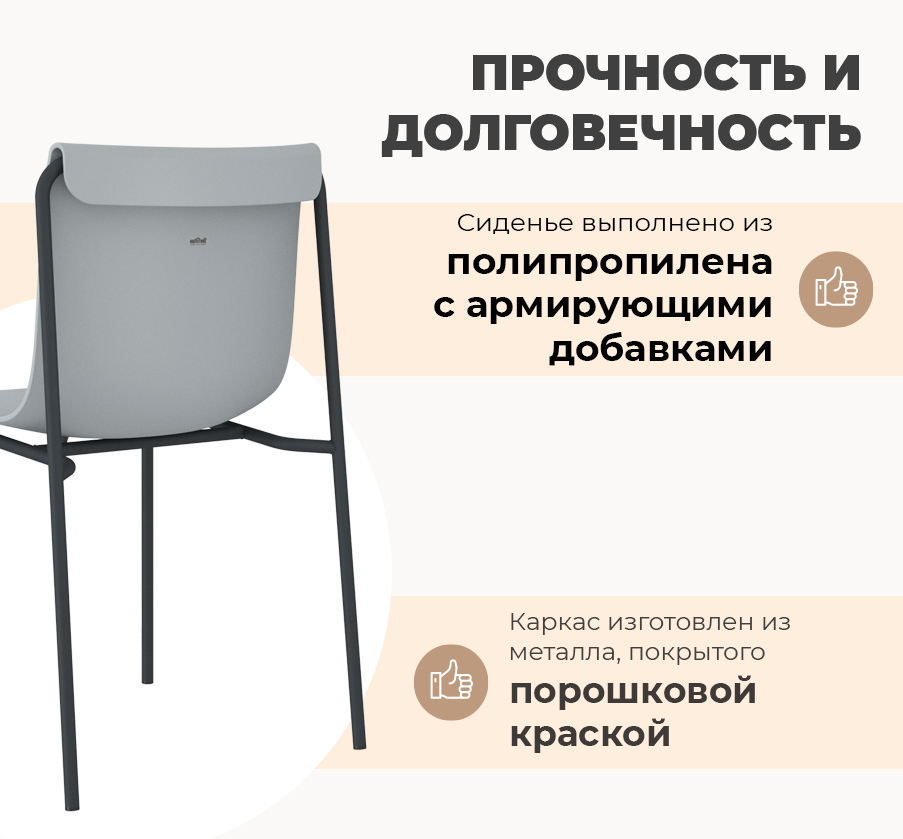 Сиденье изготовлено из полипропилена с армирующими добавками, что обеспечивает высокую жёсткость и надёжность. Материал устойчив к ударам, механическим воздействиям и появлению царапин.