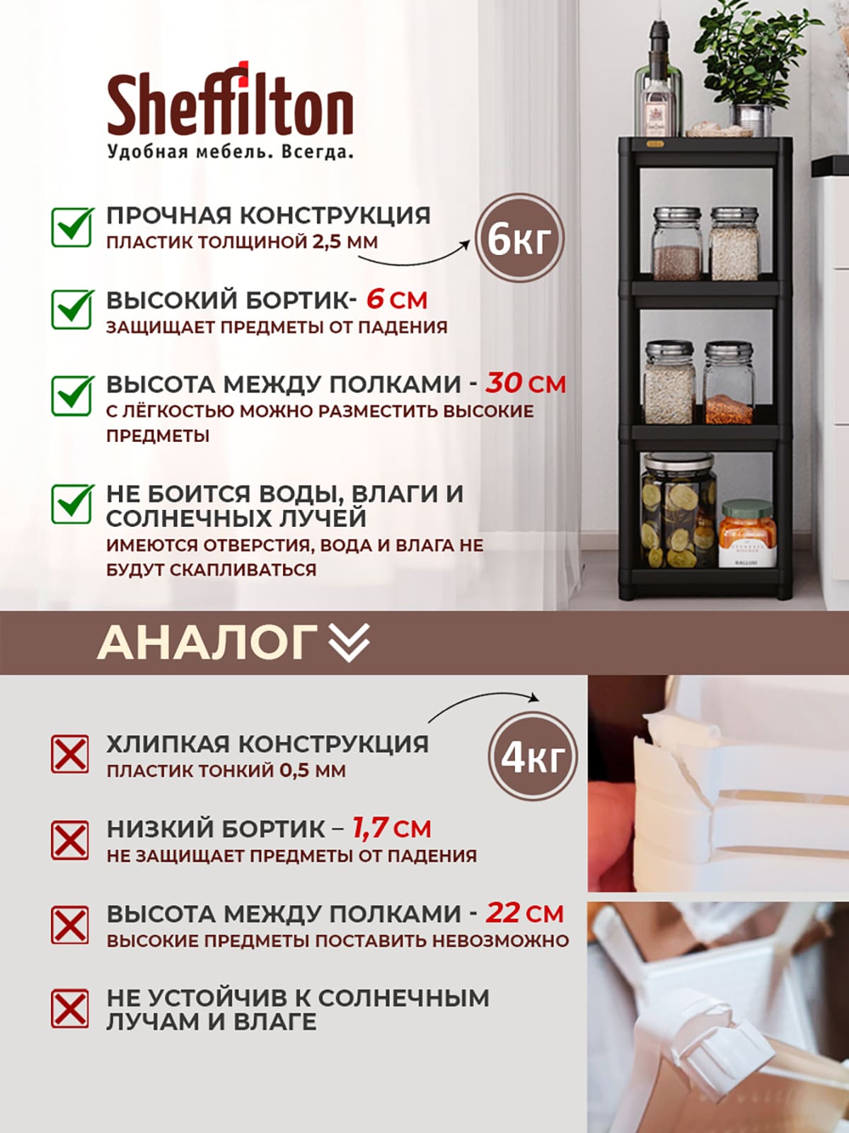 Этот стеллаж оснащён четырьмя полками с бортиками высотой 6 см , которые надежно защищают ваши вещи от падения. На дне каждой полки имеются отверстия, благодаря которым влага и вода не будут накапливаться.