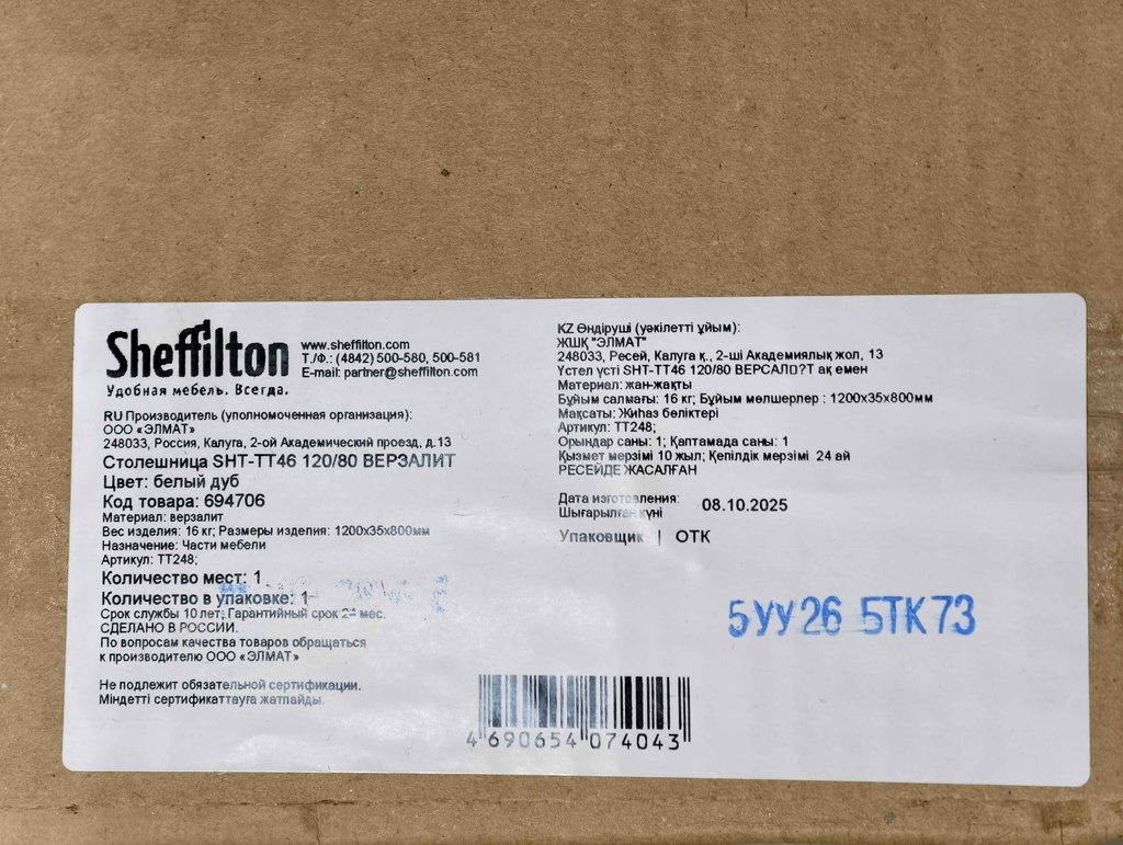 Характеристики индивидуальной упаковки Столешница SHT-TT46 120/80 ВЕРЗАЛИТ