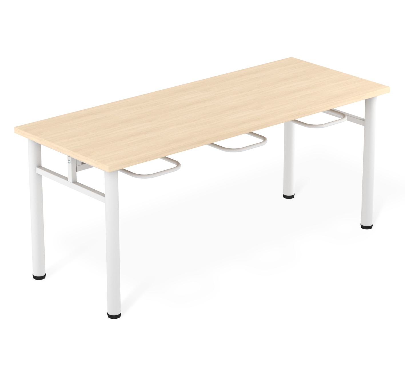 Главная особенность модели — специальные подвесы для размещения табуретов. Благодаря этому табуреты можно легко поднять и зафиксировать, освободив пространство под столом. Такое решение существенно упрощает уборку пола, позволяет быстрее проводить влажную уборку и поддерживать чистоту в помещении.